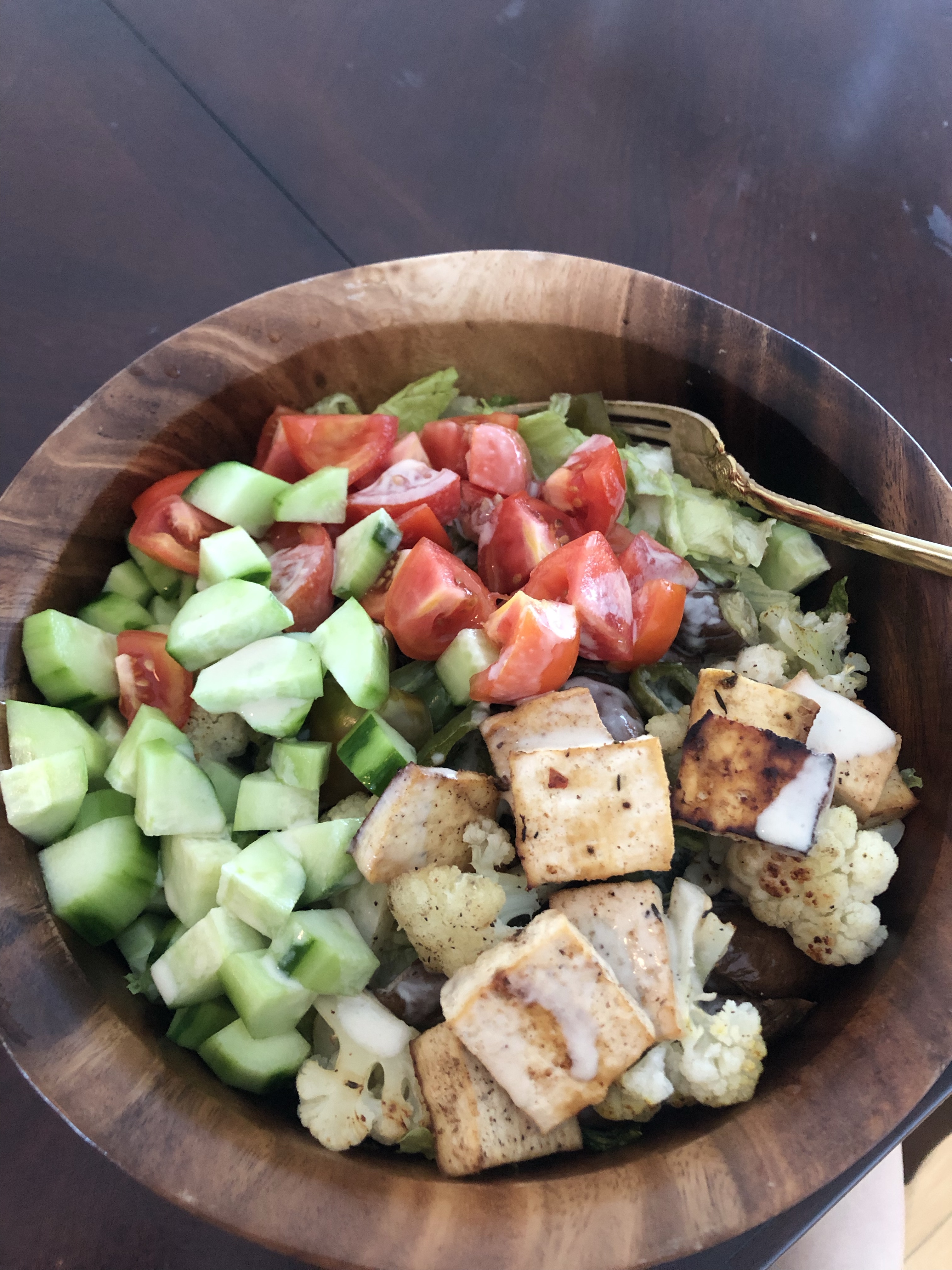 and a big salad is my kind of reset meal after travel. My body naturally craves freshness an crunchiness from vegetables. I had three salads for three days: lettuce, tomato, cucumber, roasted cauliflower, eggplant, green bell pepper and tofu. With tahini/lemon dressing. So simple but so satisfying.