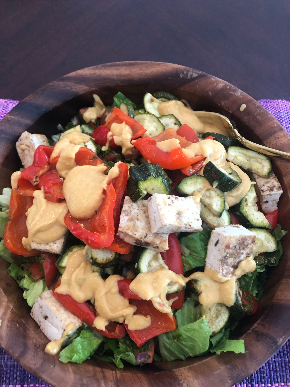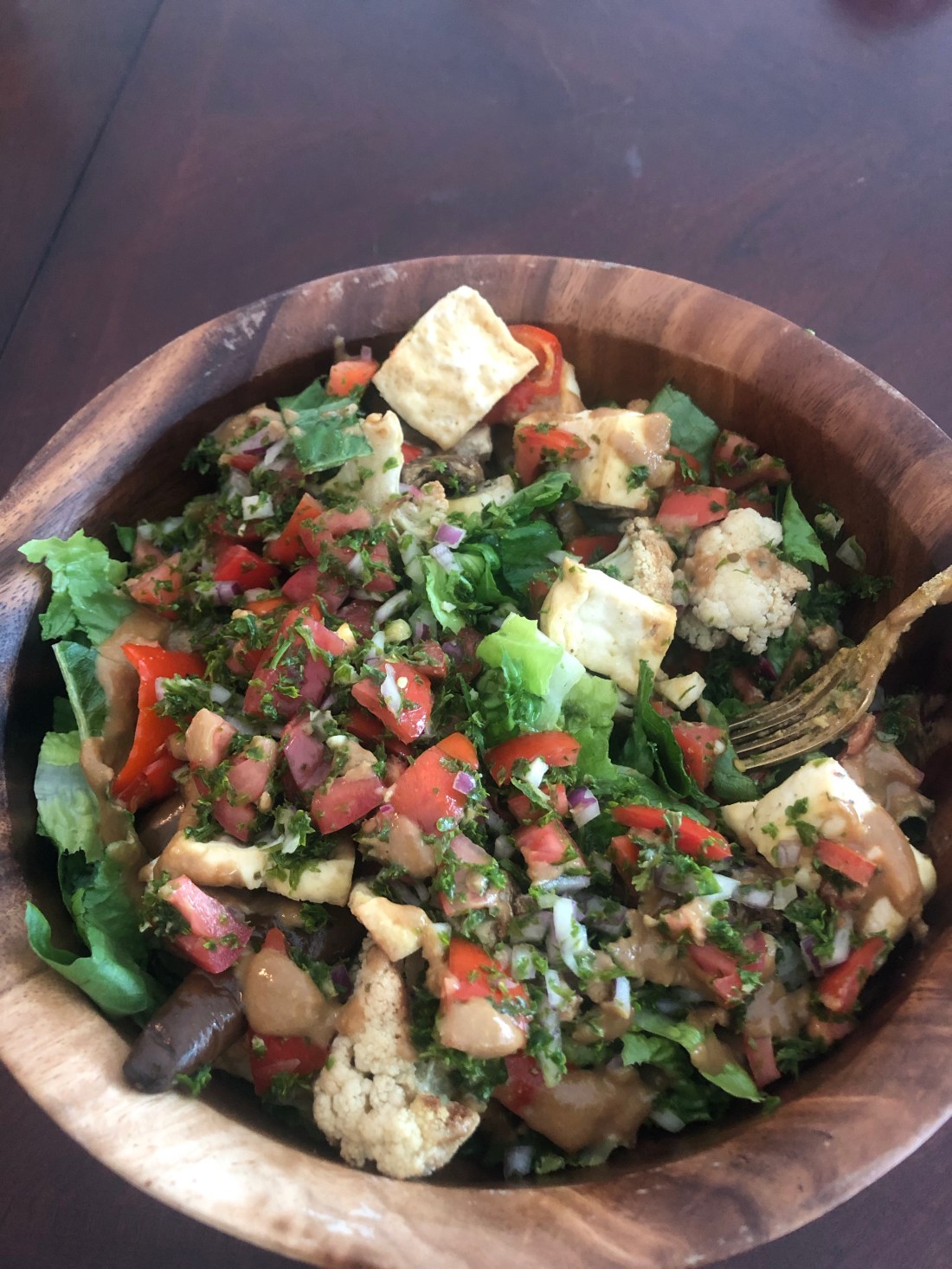 salad with tons of veggies as topping. this one had lettuce, roasted cauliflower, eggplant, pico de gallo, bell pepper and tofu. Dressing was tahini balsamic and maple syrup.