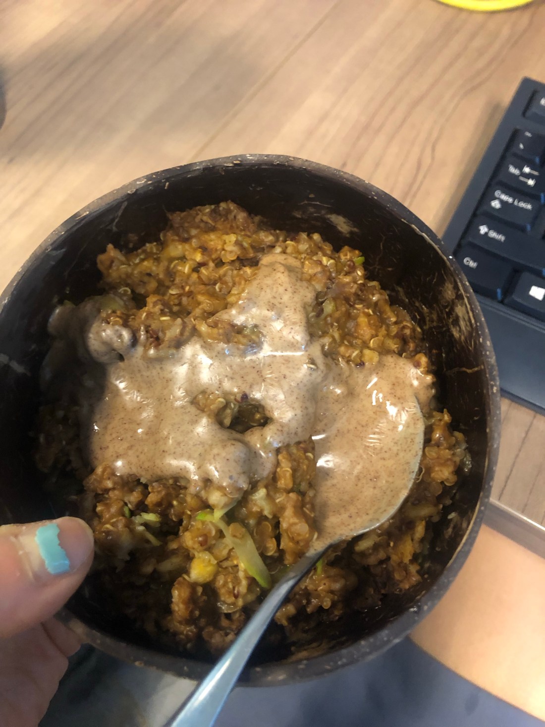 Breakfast oatmeal with some leftover shredded zucchini that needed to be used up with copious amount of almond butter