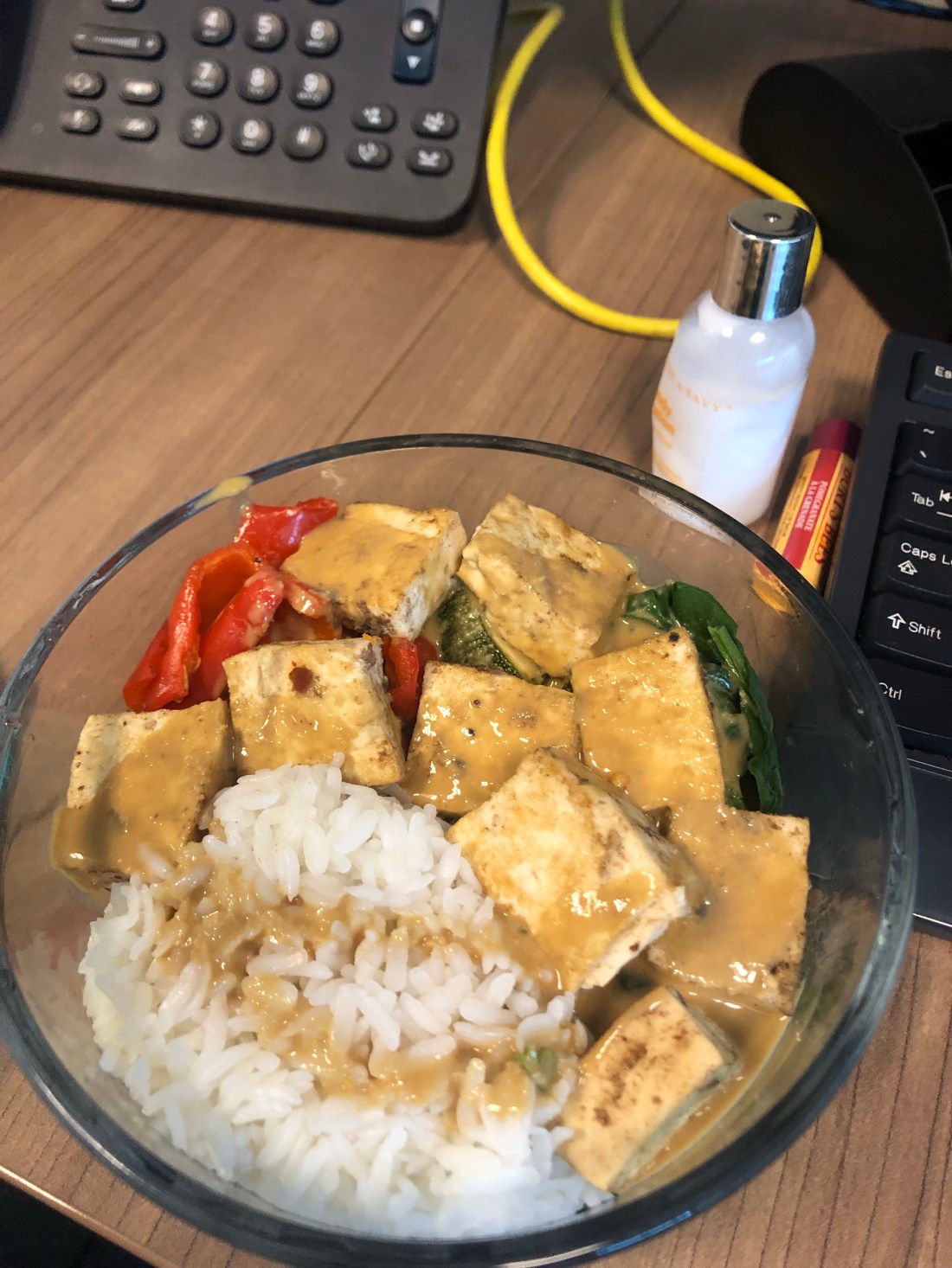 an office desk lunch of leftover rice, boiled spinach, roasted zucchini and bell pepper and tofu, with tahini dressing.