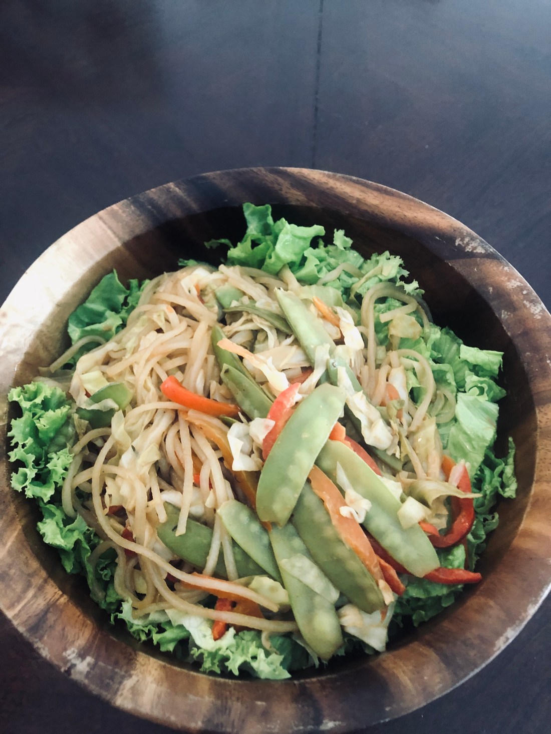 bed of lettuce topped with stir fry rice noodles with vegetables with a peanut butter sauce.