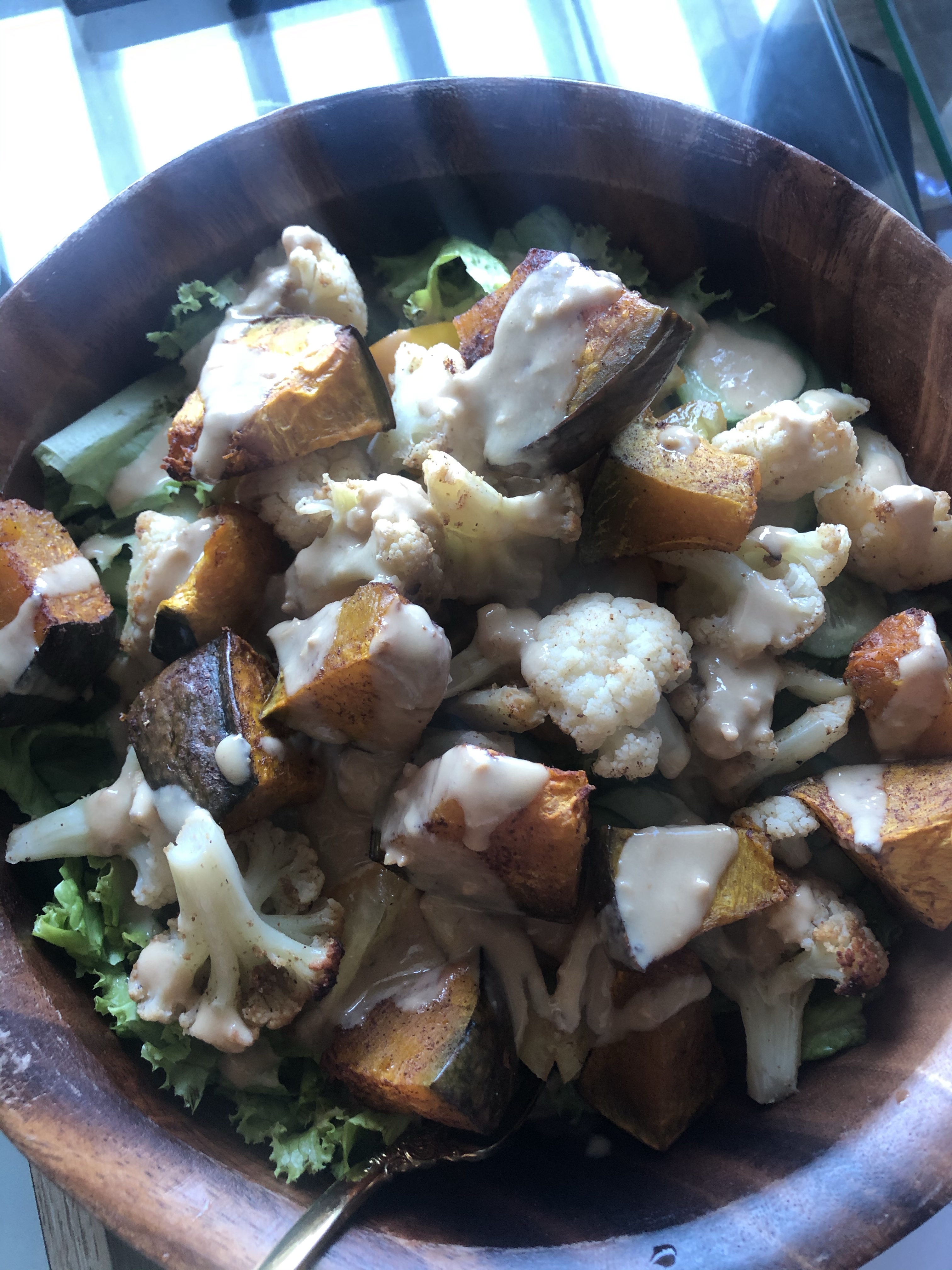 had salad twice for lunch last week as I usually don’t have much time to cook for lunch. this combo had lettuce, tomato, cucumber, roasted pumpkin and cauliflower with tahini sauce.
