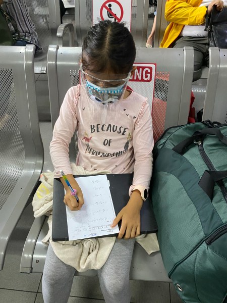 I was a bit anxious about traveling yesterday as we haven’t done in the past four months. Even Sofia thought it was a long time since we last took a flight (4 months ago). Hahahah… I know how lucky we are. But given the pandemic I really didn’t know what to expect since domestic travel with kids was only recently opened up. So we left home 8:30am for a 10:50am domestic flight. We got at the airport at 8:55am and done with check in and security by 9:10. So fast! We had one hour before our boarding time. Girls were ready to tackle some kumon meanwhile. 🙂