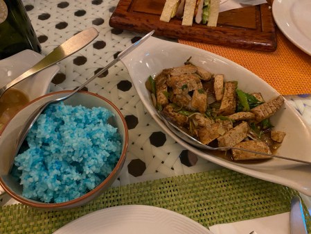 Lizzy had fried chicken and I had a sautéed vegetable, tofu with thai basil and blue pea rice (a wild flower that makes the rice blue)
