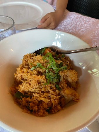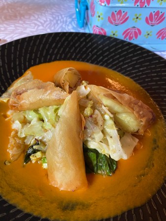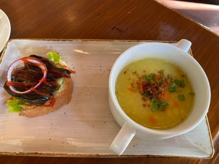 toast with eggplant and a vegetables porridge. And unlimited bread, pancakes. juices and coffee.