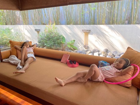 Our room is the Palmera Glass Villa, a single house surrounded by bamboo, water fountain. We absolutely love our villa. The girls slept at this lounge sofa.