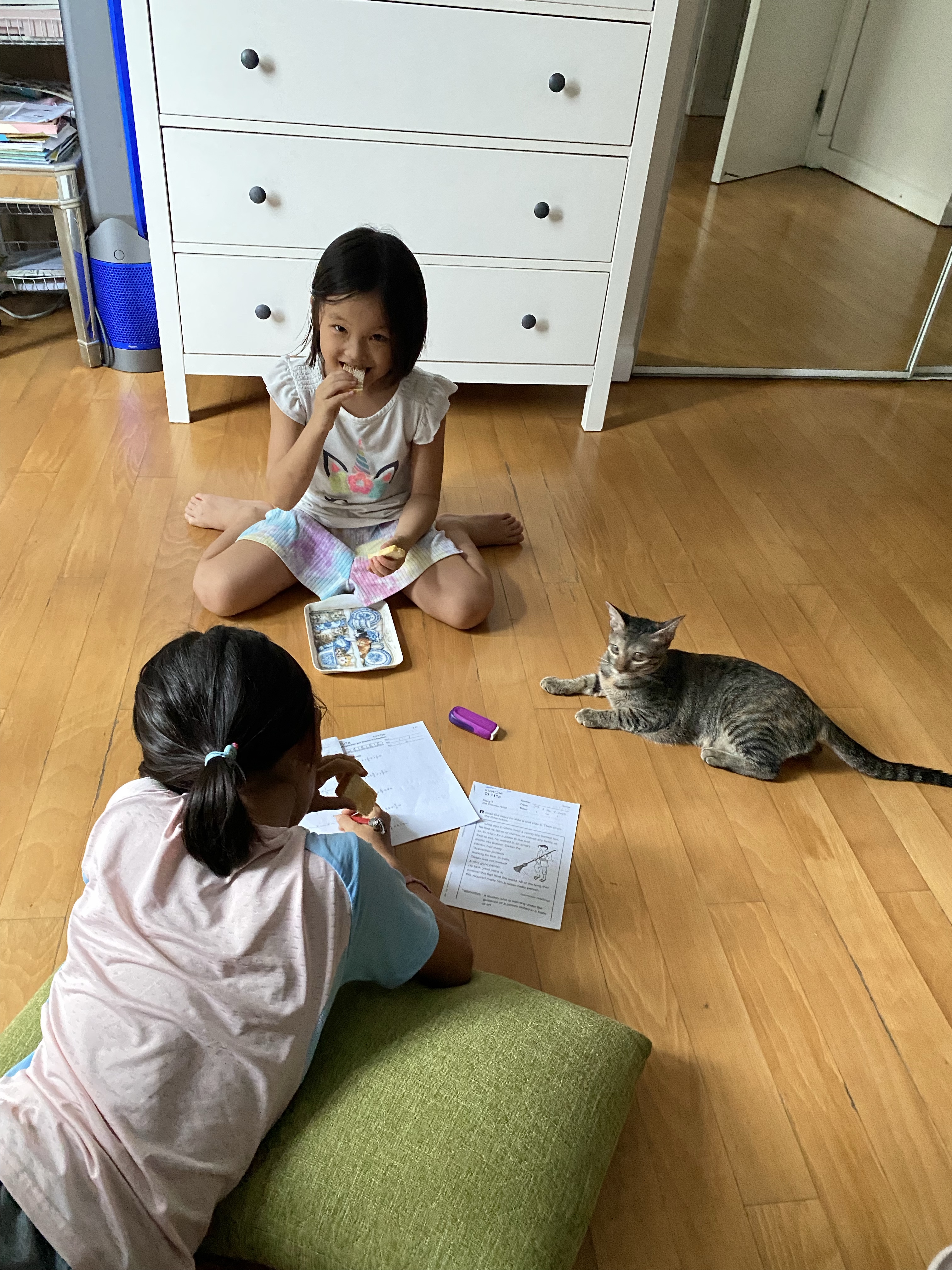 And look how she thinks she’s just one of the girls too. The girls decided to have little snack on the floor (why kids always prefer floor to table???), and Cookie quickly joined them.