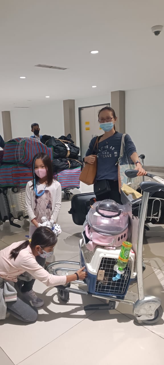 Pic of us after arrival, before they took Cookie for 2 weeks quarantine.