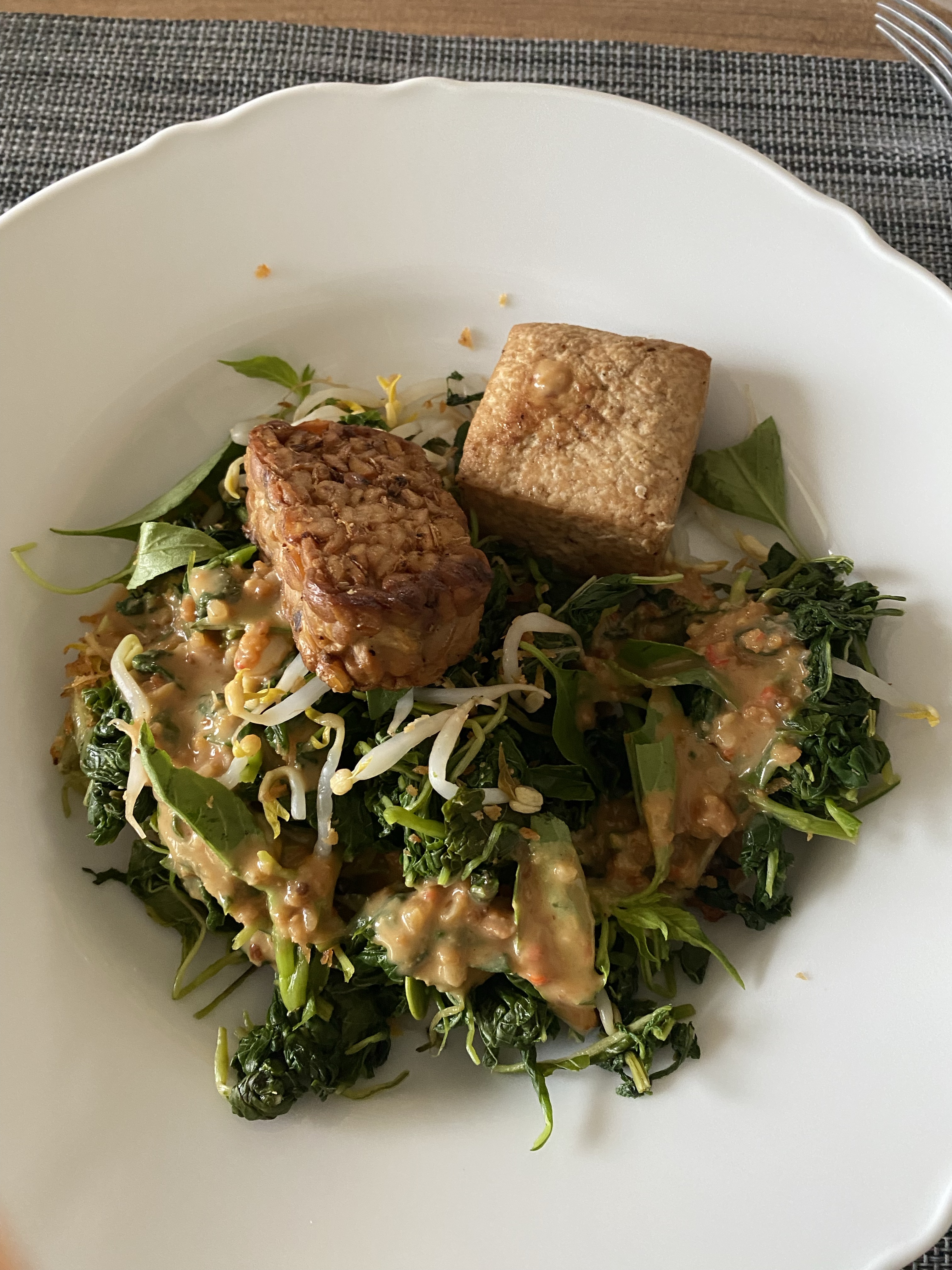 which I had as breakfast: assorted vegetables with a spicy peanut sauce, tofu and tempeh. It’s super a perfect combo for me!!! Love love love!