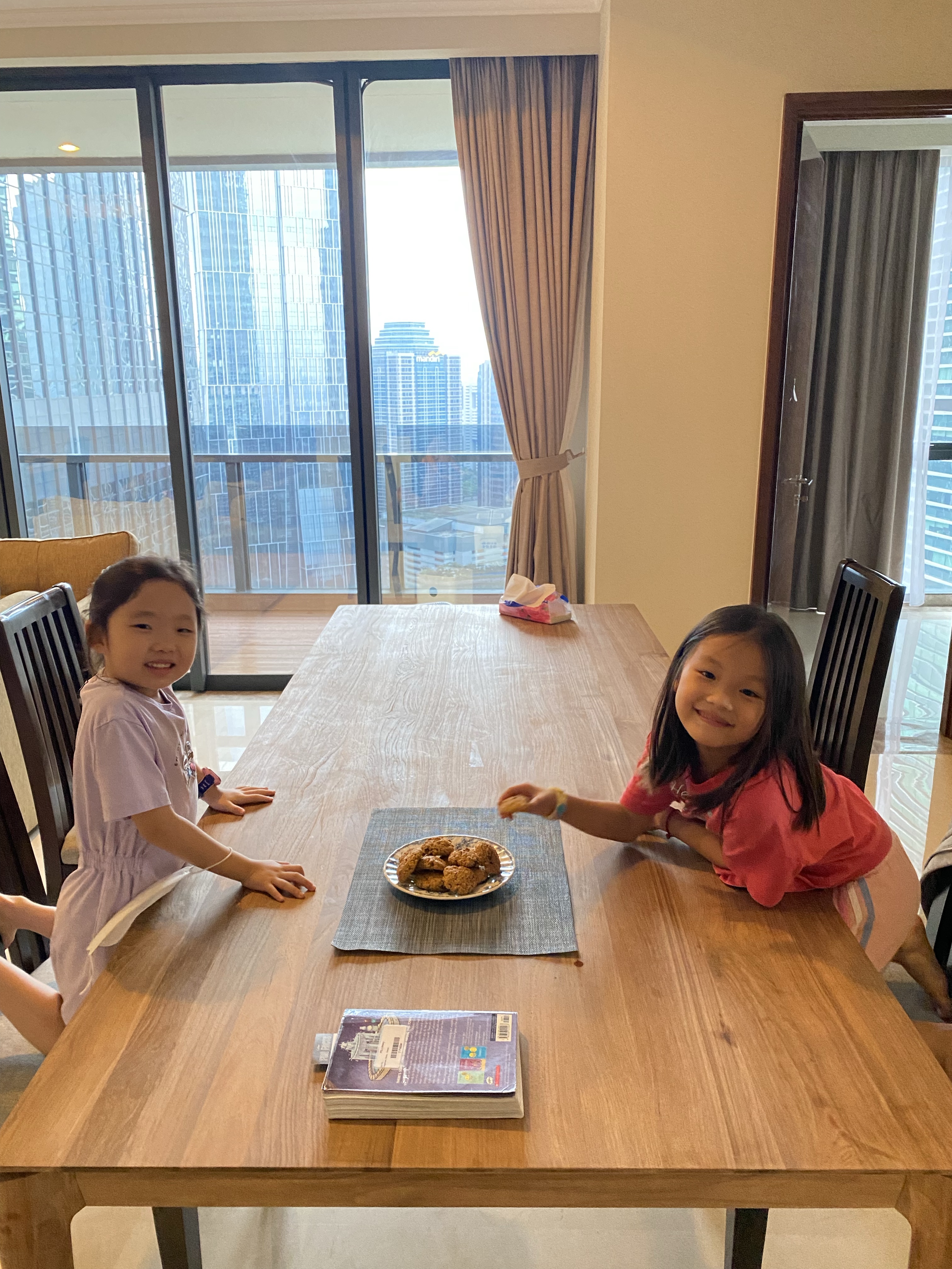 While girls had art lessons at home, I planned for the week ahead, tidied up the room, and set up playdates for the afternoon.Then we went to have lunch at Grains of Glory, 200 meters from our place. It was absolutely the best meal I had so far in Jakarta! My plate had cauliflower rice with lentils, cucumber pickles, vegetables, and balinese spicy chicken. Sofia had her plate with brown rice, veggies, and best grilled salmon she said she ever had. Lizzy had brown rice with pulled beef (no pork in muslin country), and vegetables. We also shared baked sweet potato chips, and two kinds of brownies. Such a satisfying meal. I can’t wait to go back.