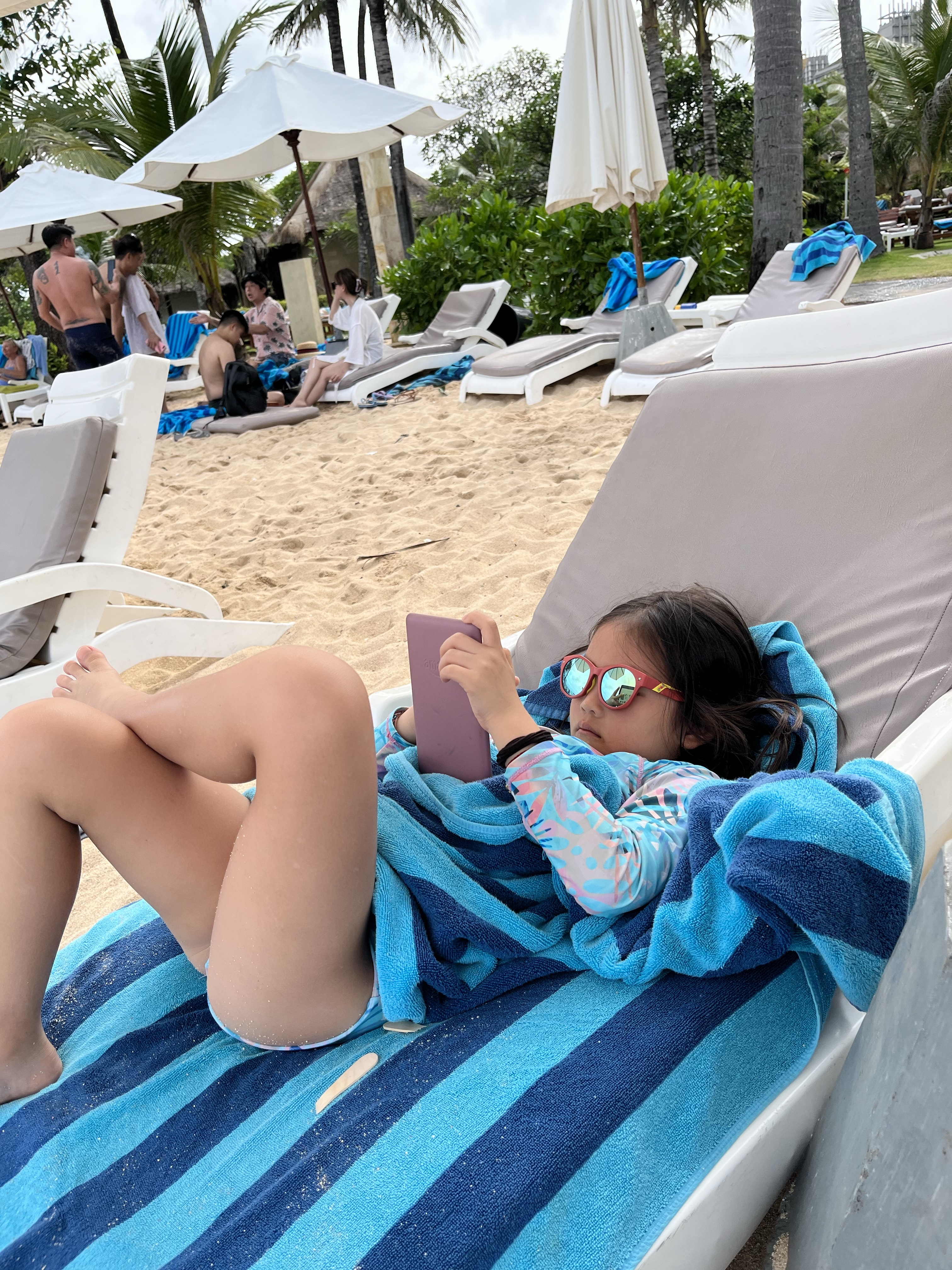 I booked this hotel as our last one because I wanted to end the trip with total relaxation. So day 7 was spent mostly on the beach with this position, 5 hours to be exact. 🙂 oh… I did venture out for a run outside the hotel before I did this.