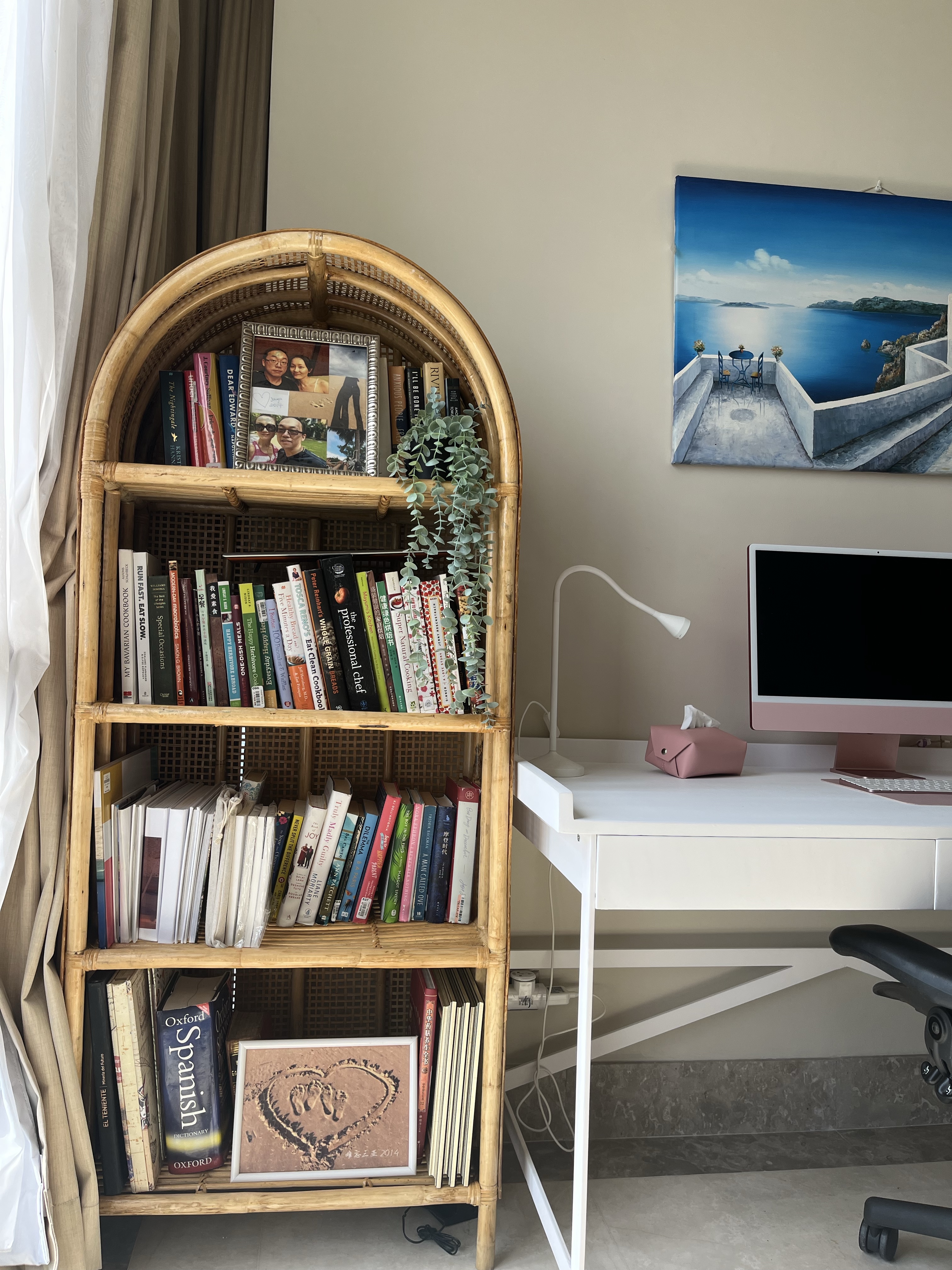 Now…. here’s the final look of my sanctuary. My tailor-made desk originally was supposed to have light wood color. But I didn’t like how it looked so I asked the person to just paint it white. I am happy that I made that decision. Instead of having a desk that I am not 100% happy, better to have the look I want even though husband says it’s waste of the good teak wood. The painting is from Santorini, a place that I DEFINITELY need to go back.