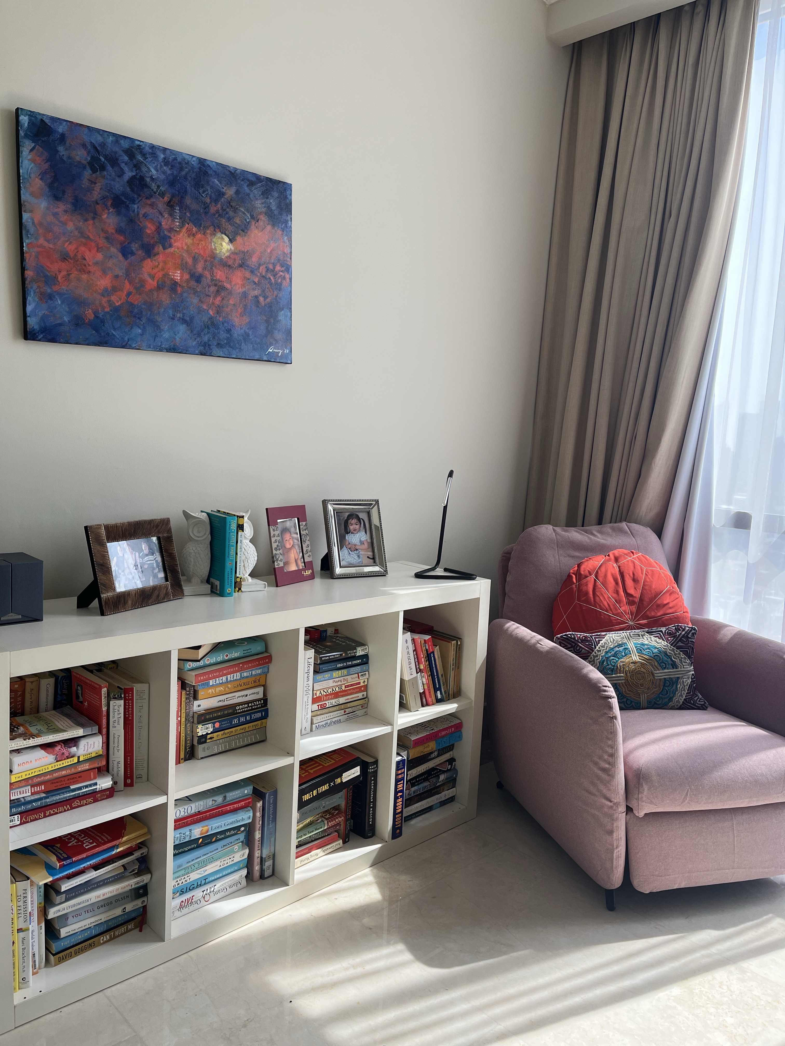 I love sitting there reading at night with two table lamps on. so cozy! The painting was made by a friend with my ask of sunset of the Philippines.