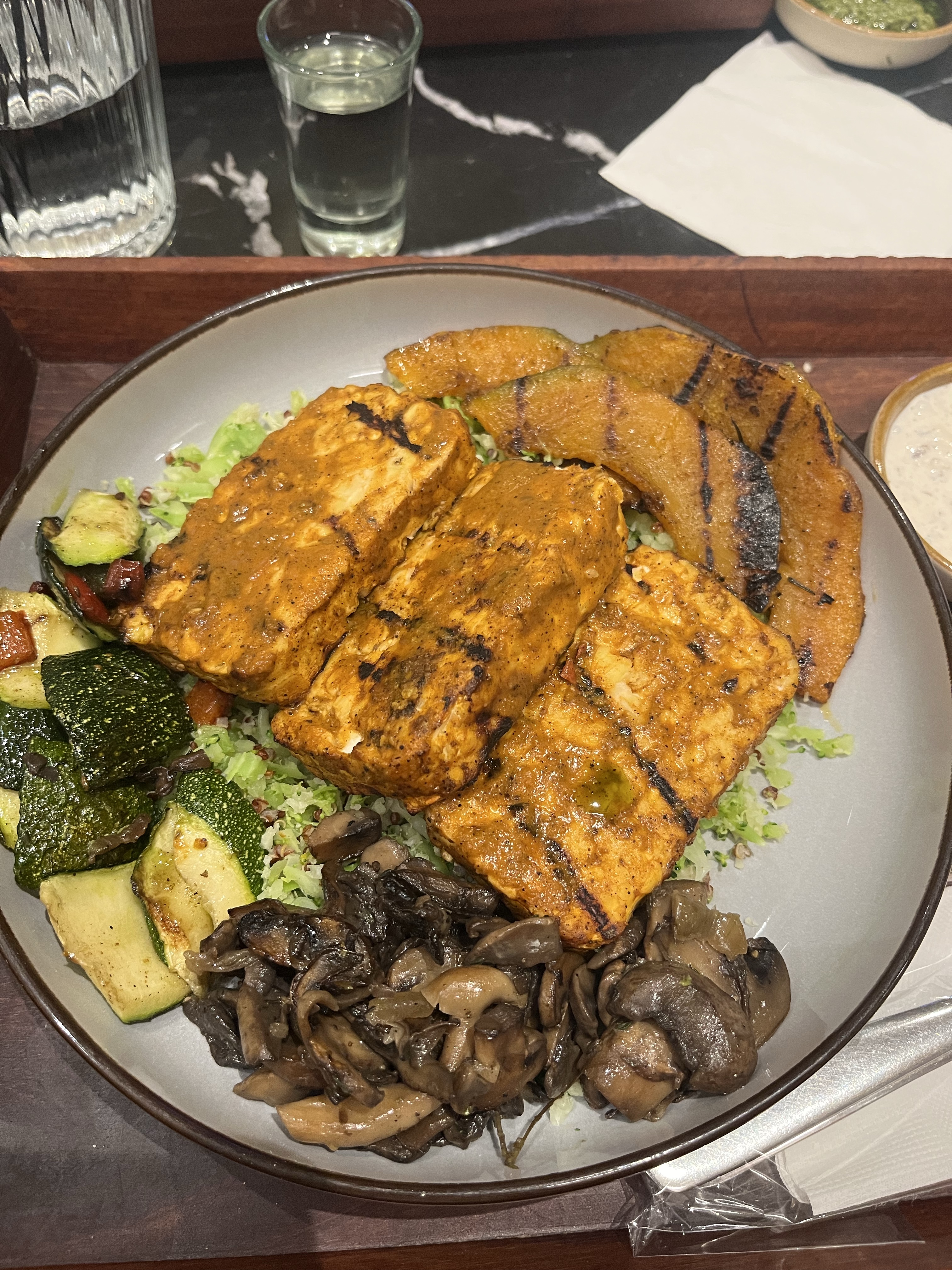 and I had this vegan bowl with barley broccoli rice, mushroom, zucchini, pumpkin and tempeh. Tempeh is soooo filling. I gave hubby 2 pieces of them. I think I prefer tofu.