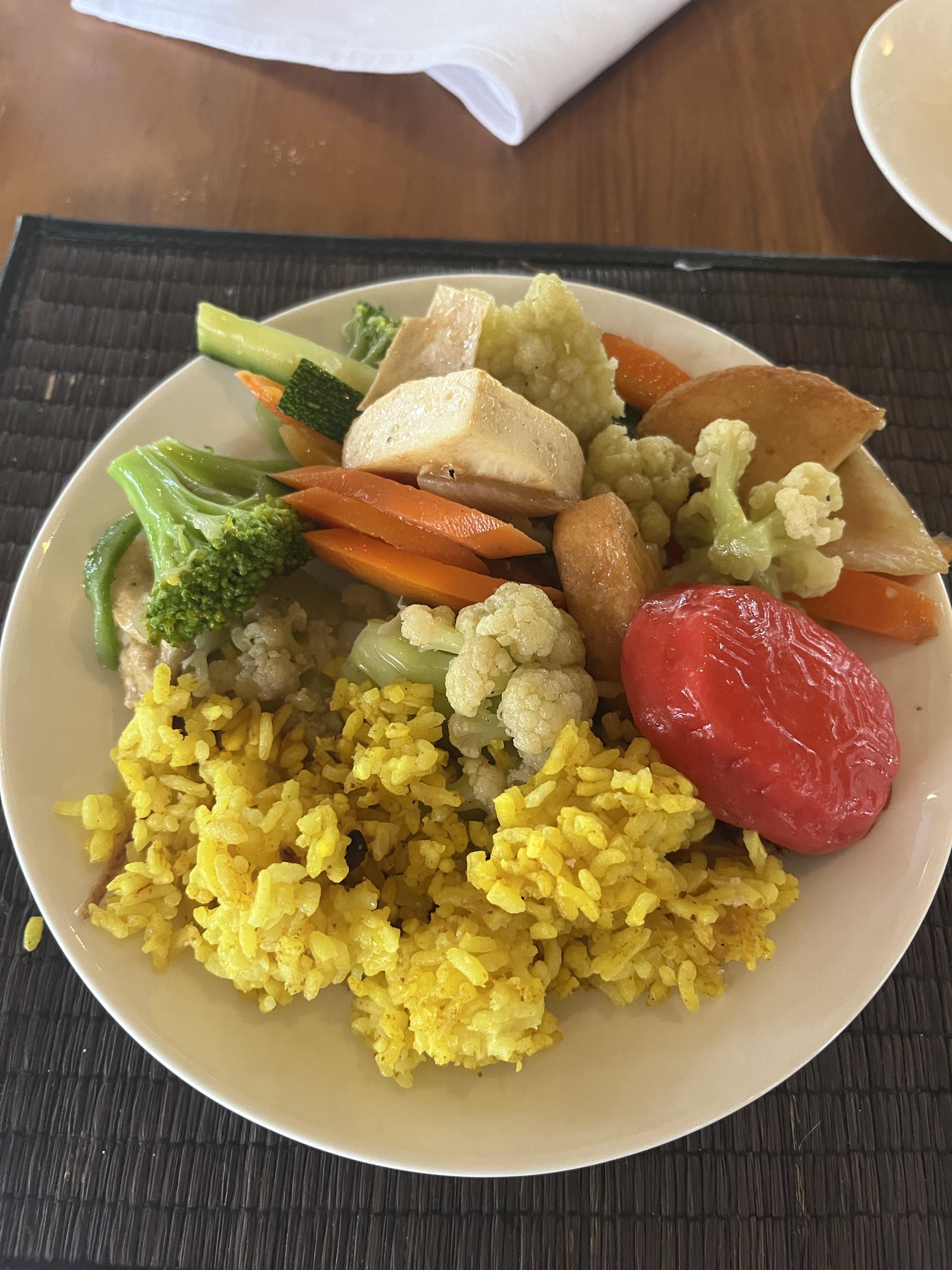 I had two plates of veg with tofu and rice, a local delicacy and plenty of fruits.