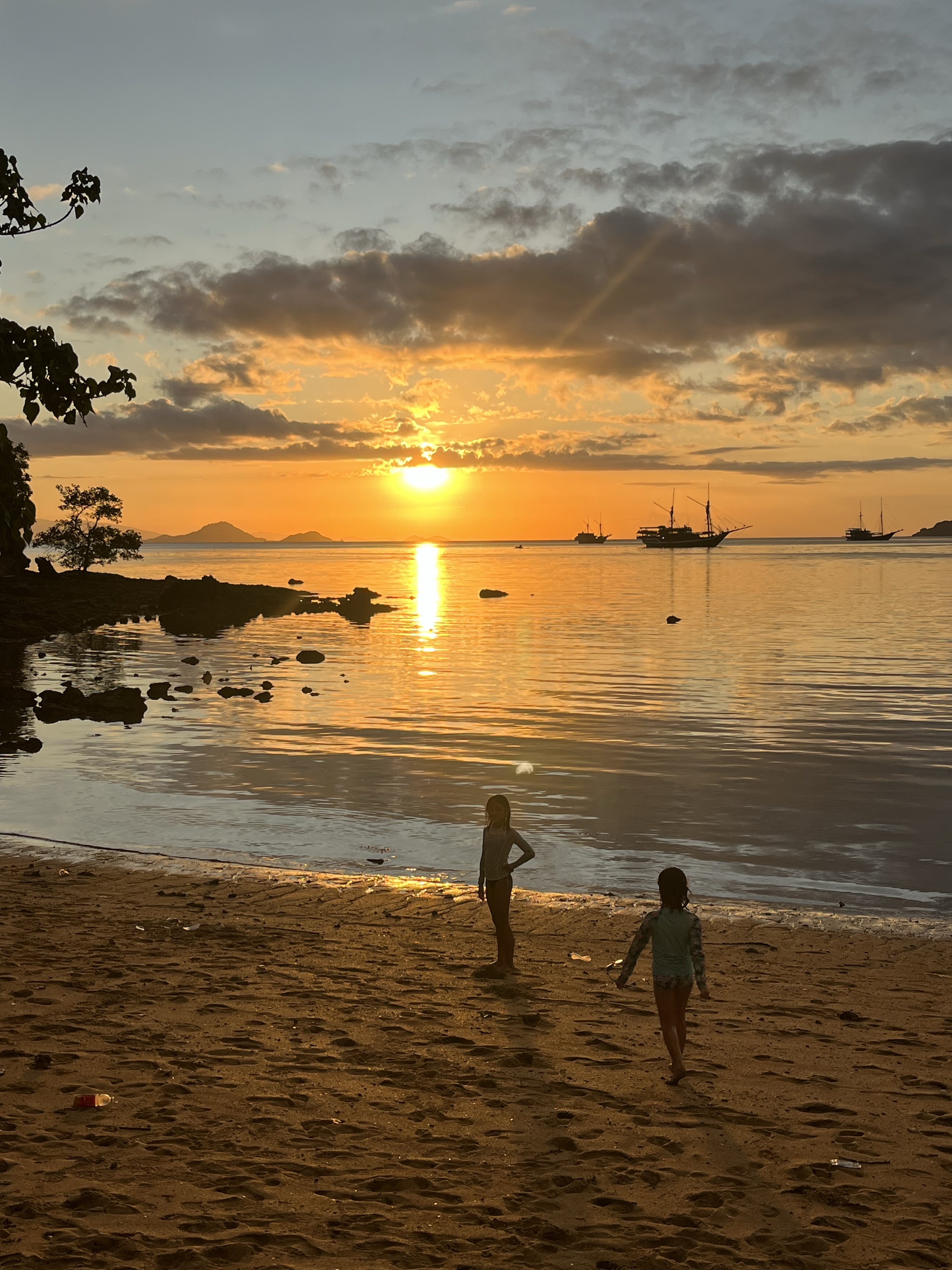 Now, back to recap our whole journey. We left Jakarta Thursday morning. We landed Komodo airport early afternoon and checked in at our hotel Bintang Flores, a small cozy 4 stars hotel near the harbor. after late lunch, girls played at the pool and we enjoyed this beautiful sunset view from the small beach.