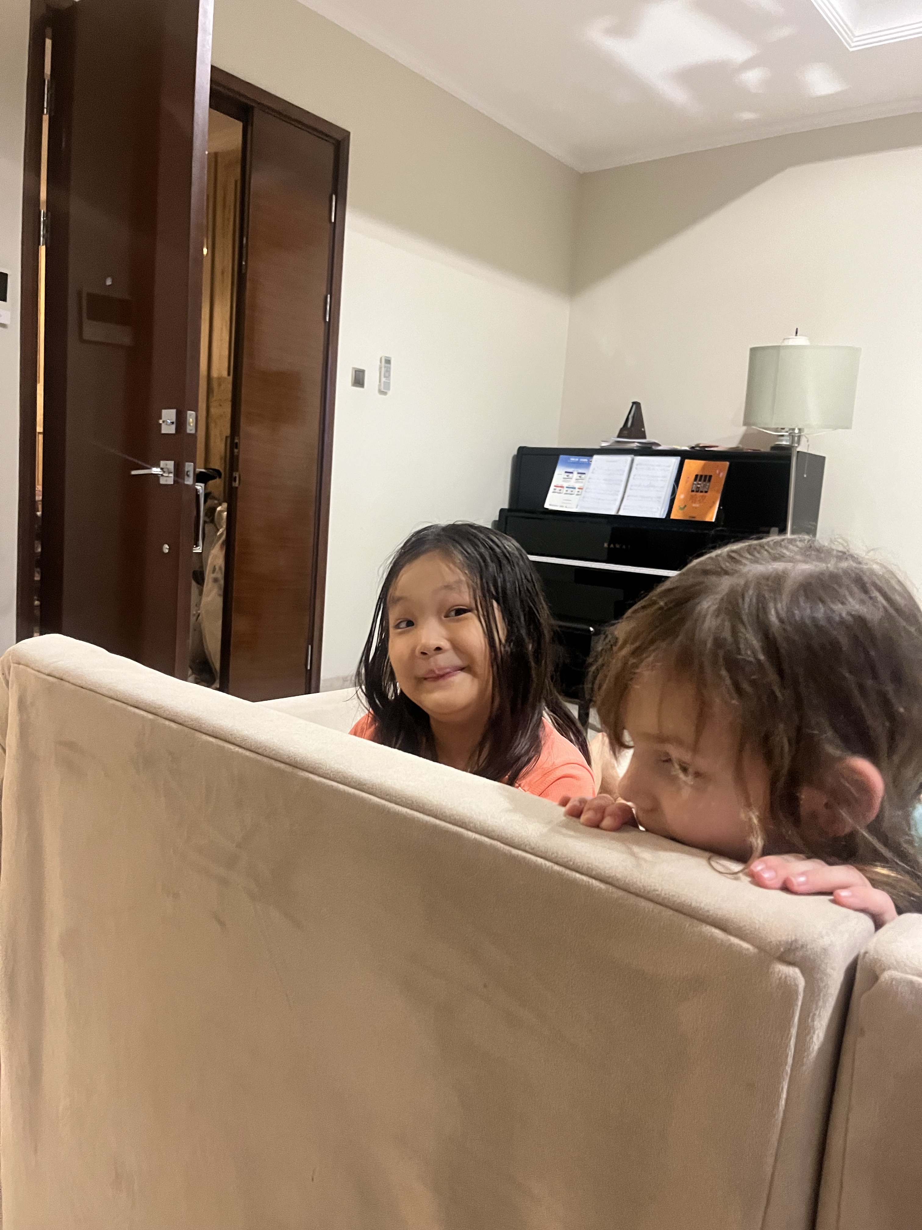 I continued my non-fiction book while girls had their quiet time. Then Lizzy’s playmate arrived. Sofia had piano theory lessons, I had massage, followed by husband to enjoy the strong deep tissue massage.