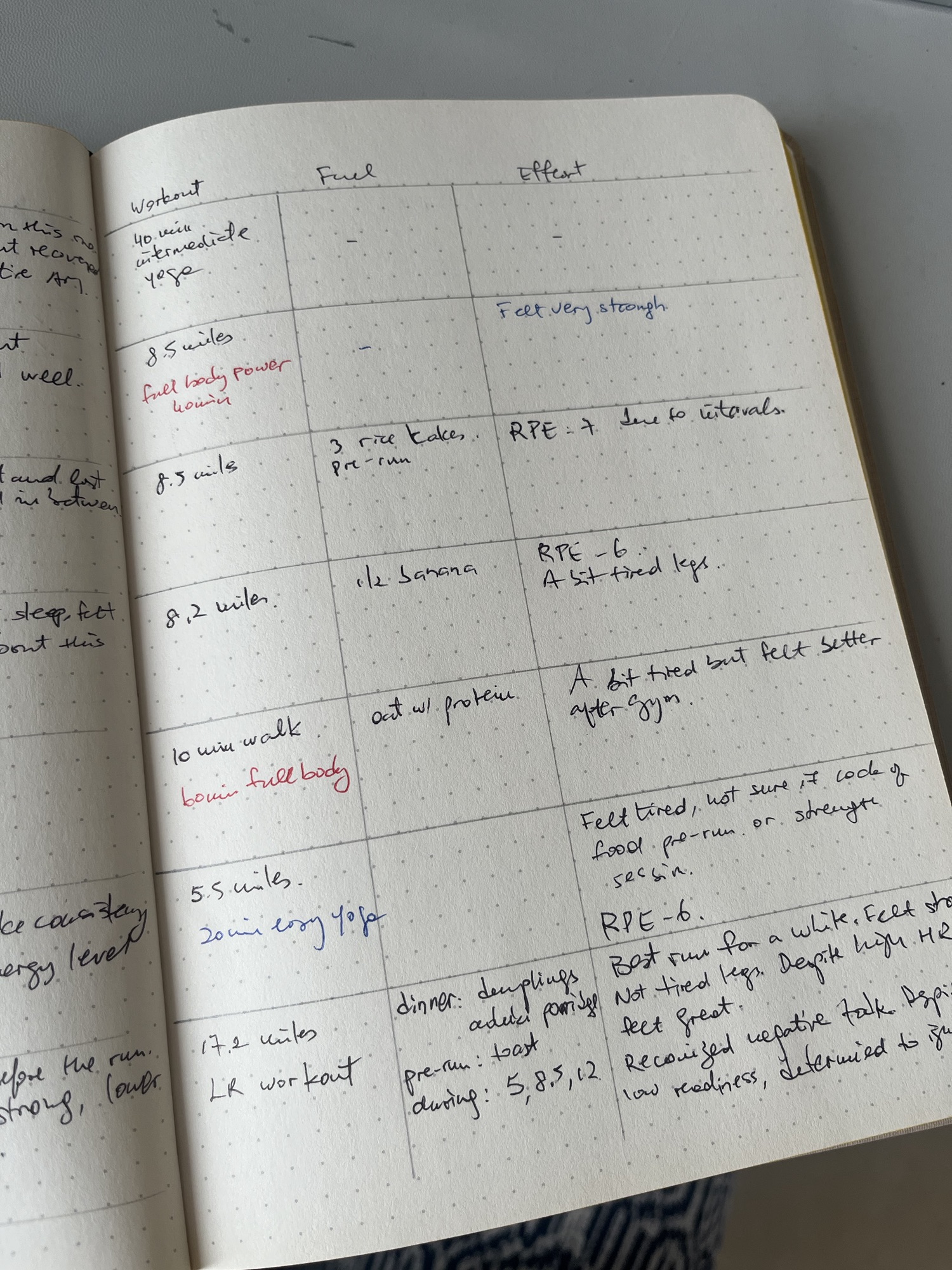 Engie asked how I keep track of my goals. I use two journals, one to track workouts as it helps me identify things that make me improve and feel better, and things that make me feel tired/sore more than usual. I write down my workouts, fueling, and how I feel during and after the workout.