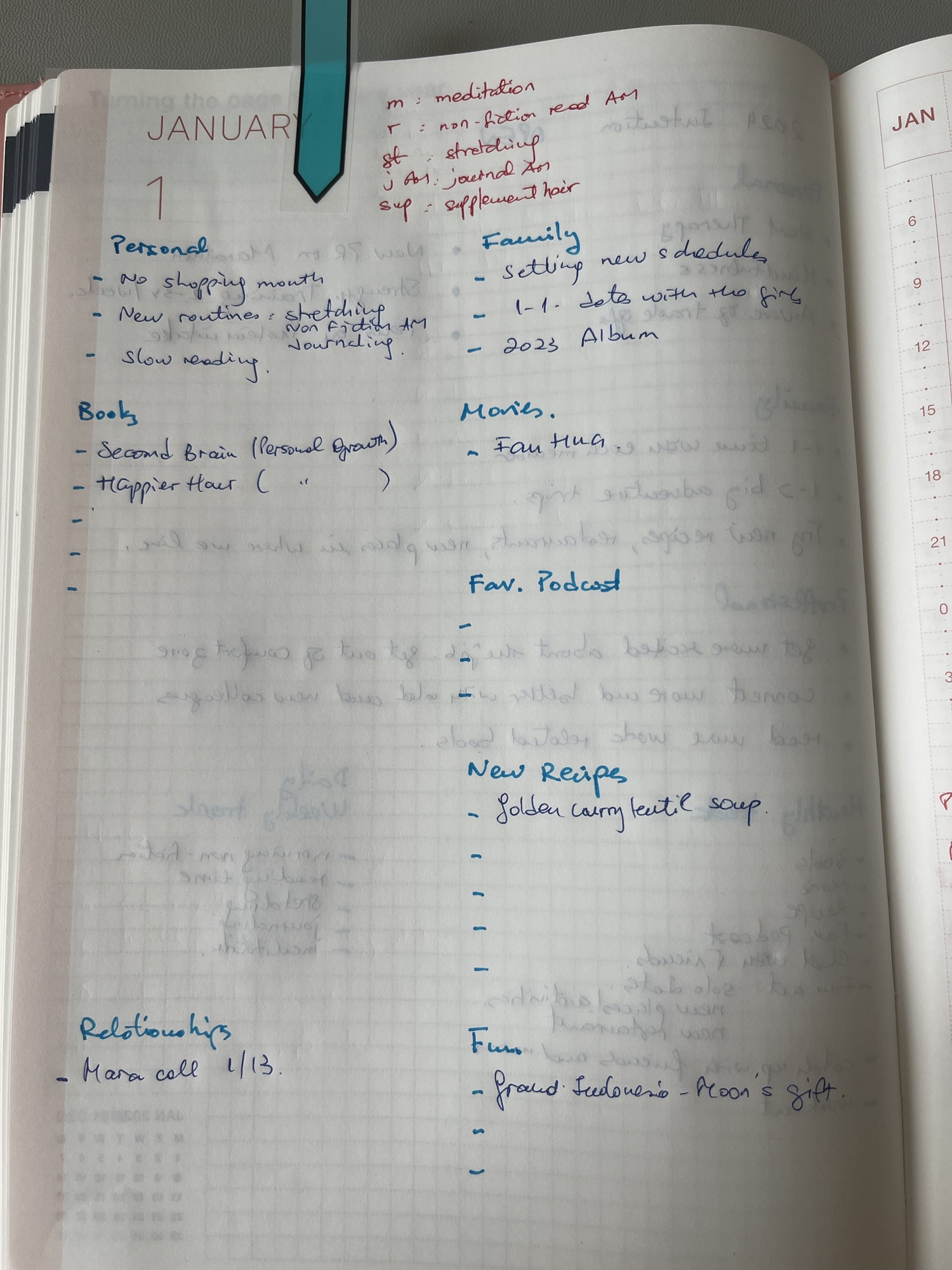 I use monthly page to keep track of my goals, books, movies, favorite podcasts, new recipes tried, something I did to cultivate relationships (new in 2024), and fun things I did with the girls.