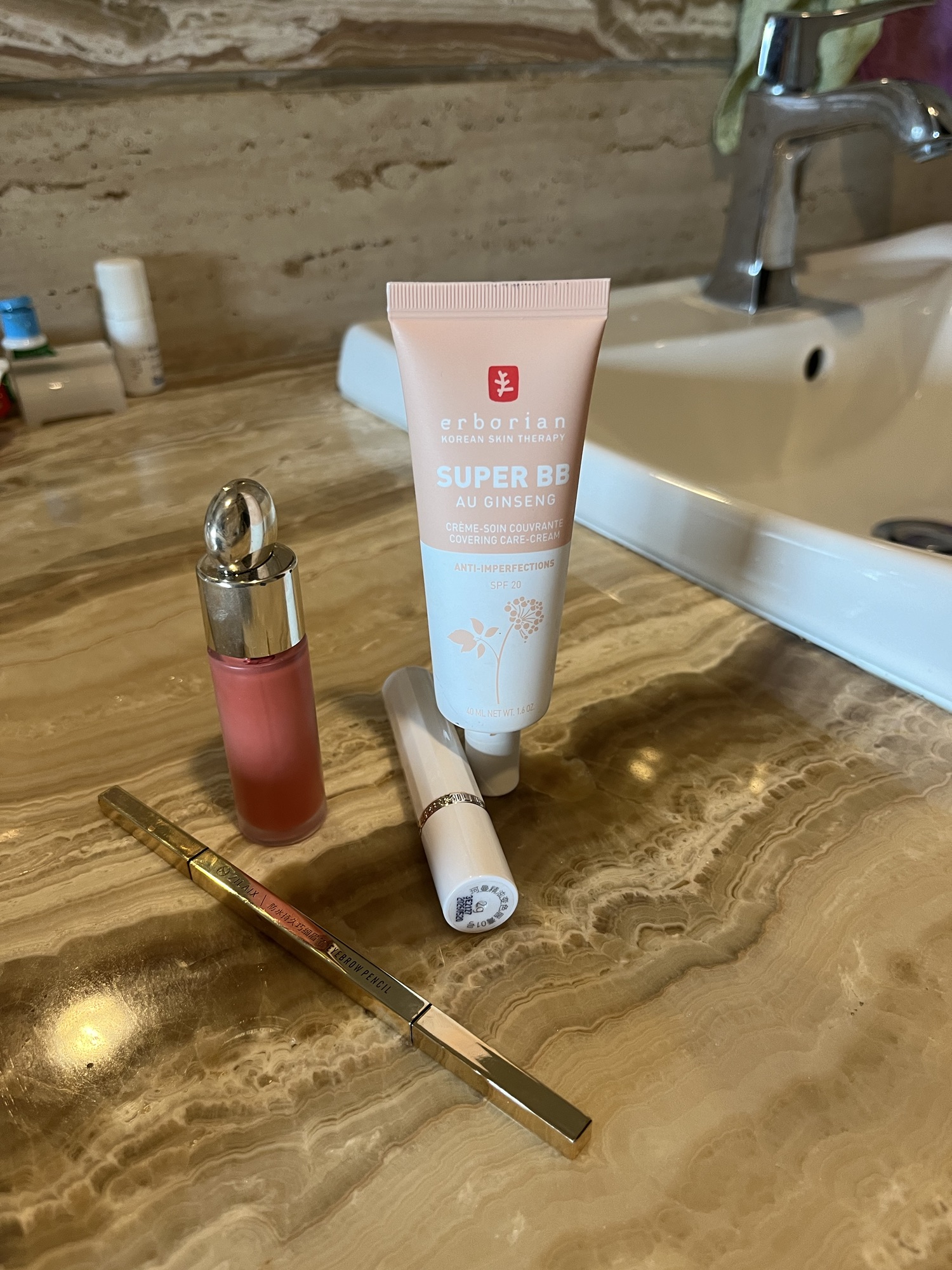 quick shower and 3 min make up. I use this super BB cream that I got in Paris (got 4 bottles after trying it), eyebrows, brush, and lipsticks. Super easy and quick.