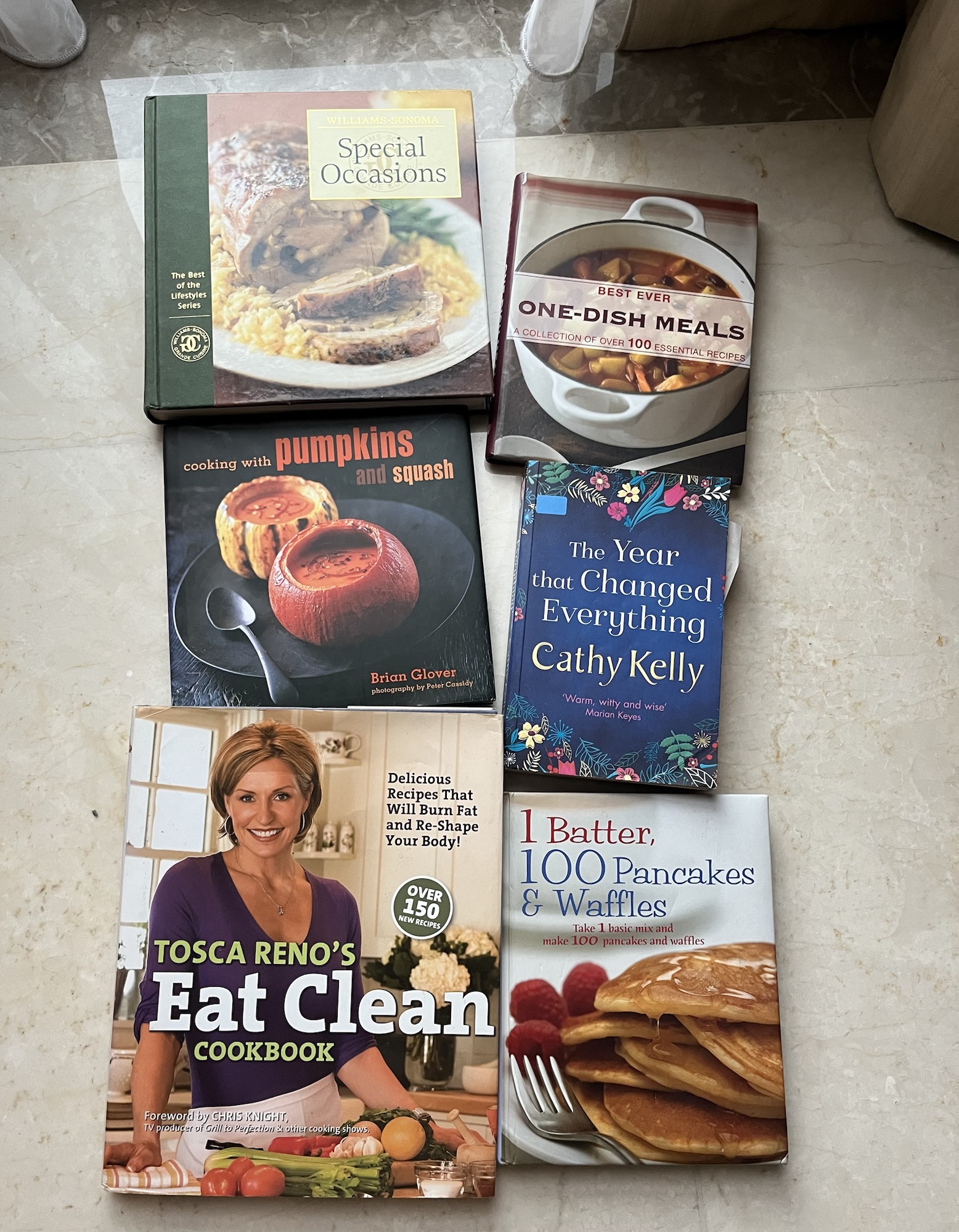 4:30pm: while Lizzy did her homework, Sofia was at swimming practice, I took out cookbooks to think what to make/meal prep this weekend. While doing that I realized some cookbooks are old and I never use them.