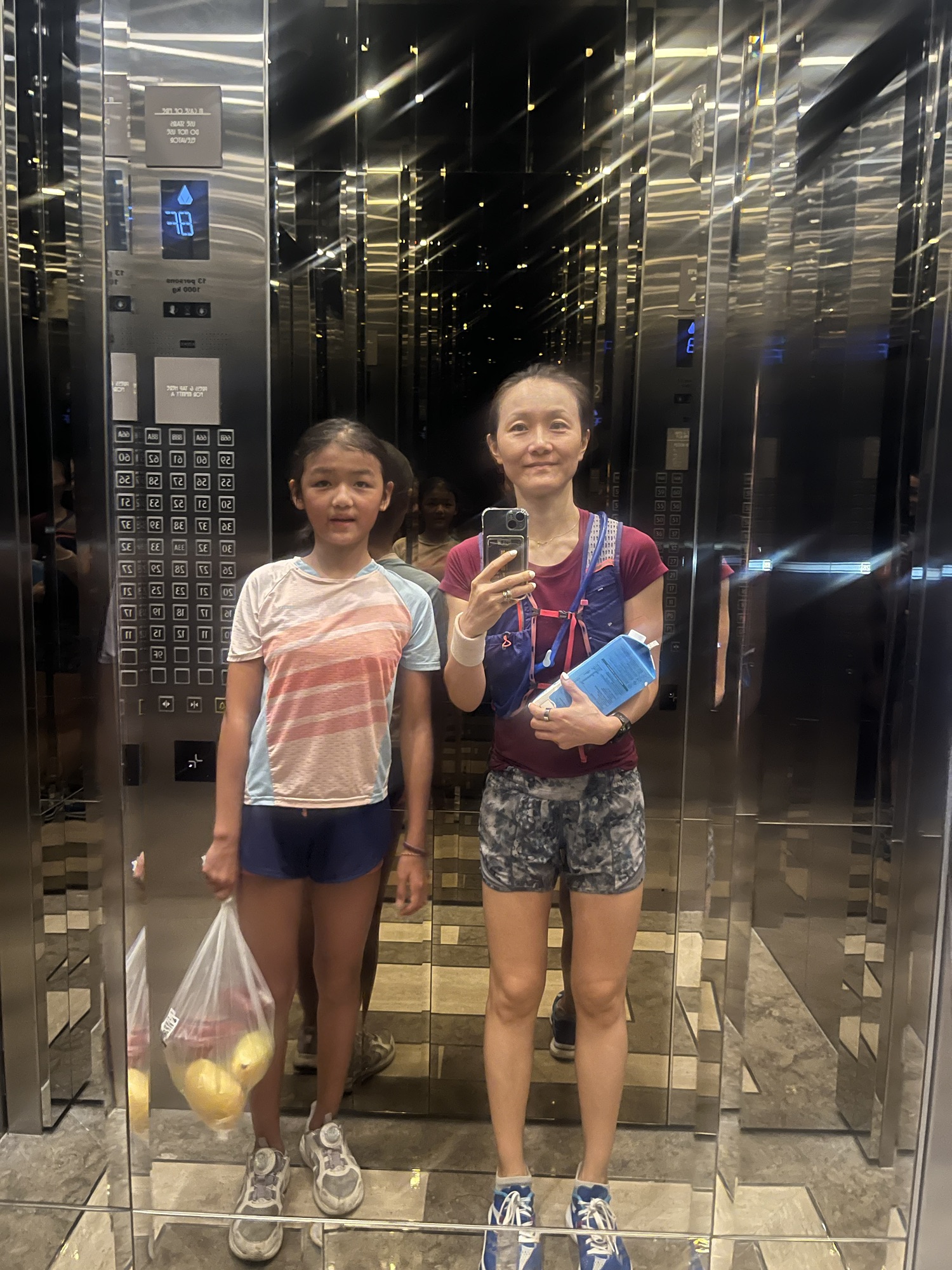 7:36: picked up Sofia outside our building and jogged with her for 28 min. It was hot and humid and sunny, so we finished in front of the food market, got iced cane sugar juice, walked back, stopped by groceries store for milk, mango and cherry tomato.