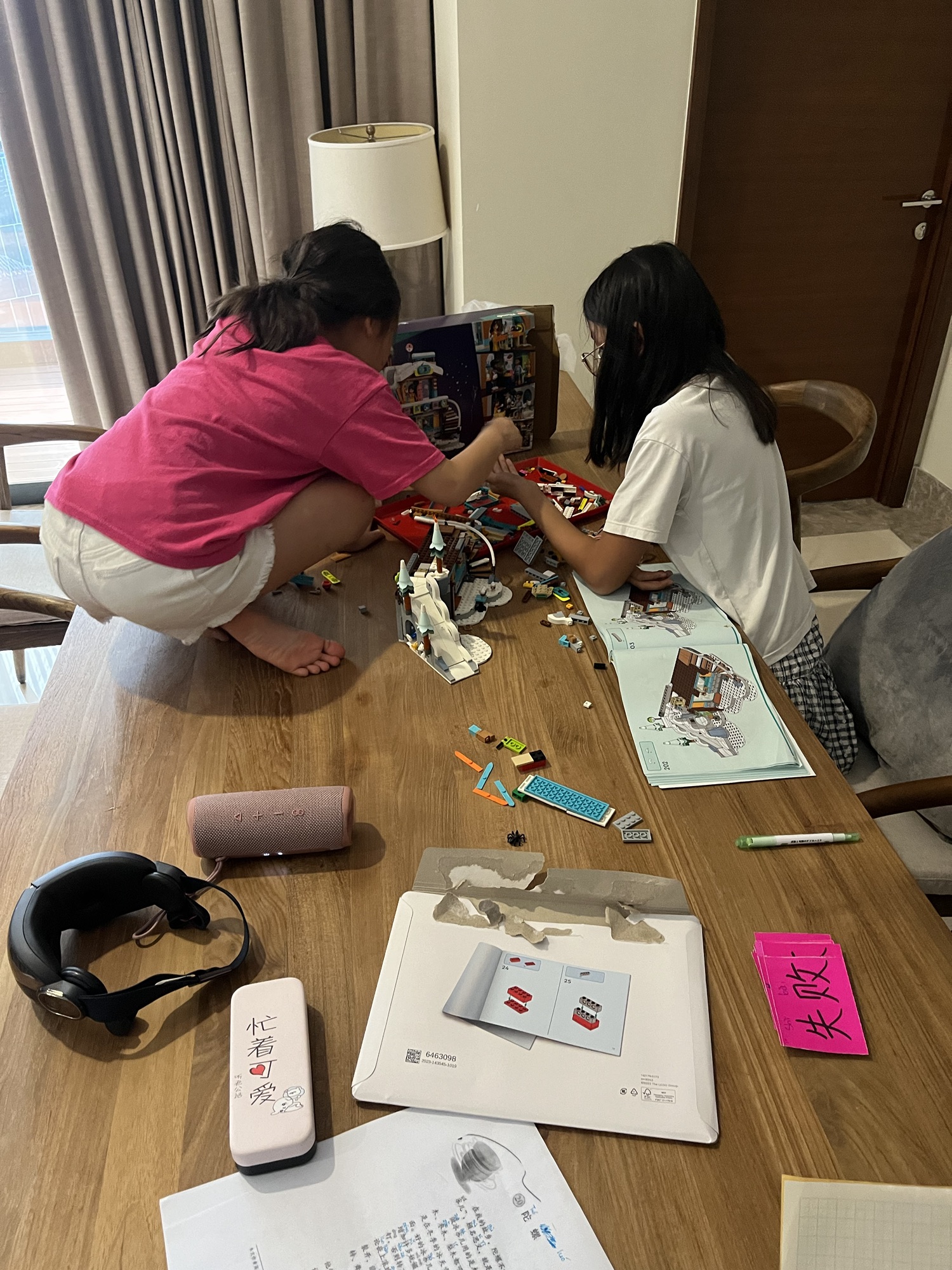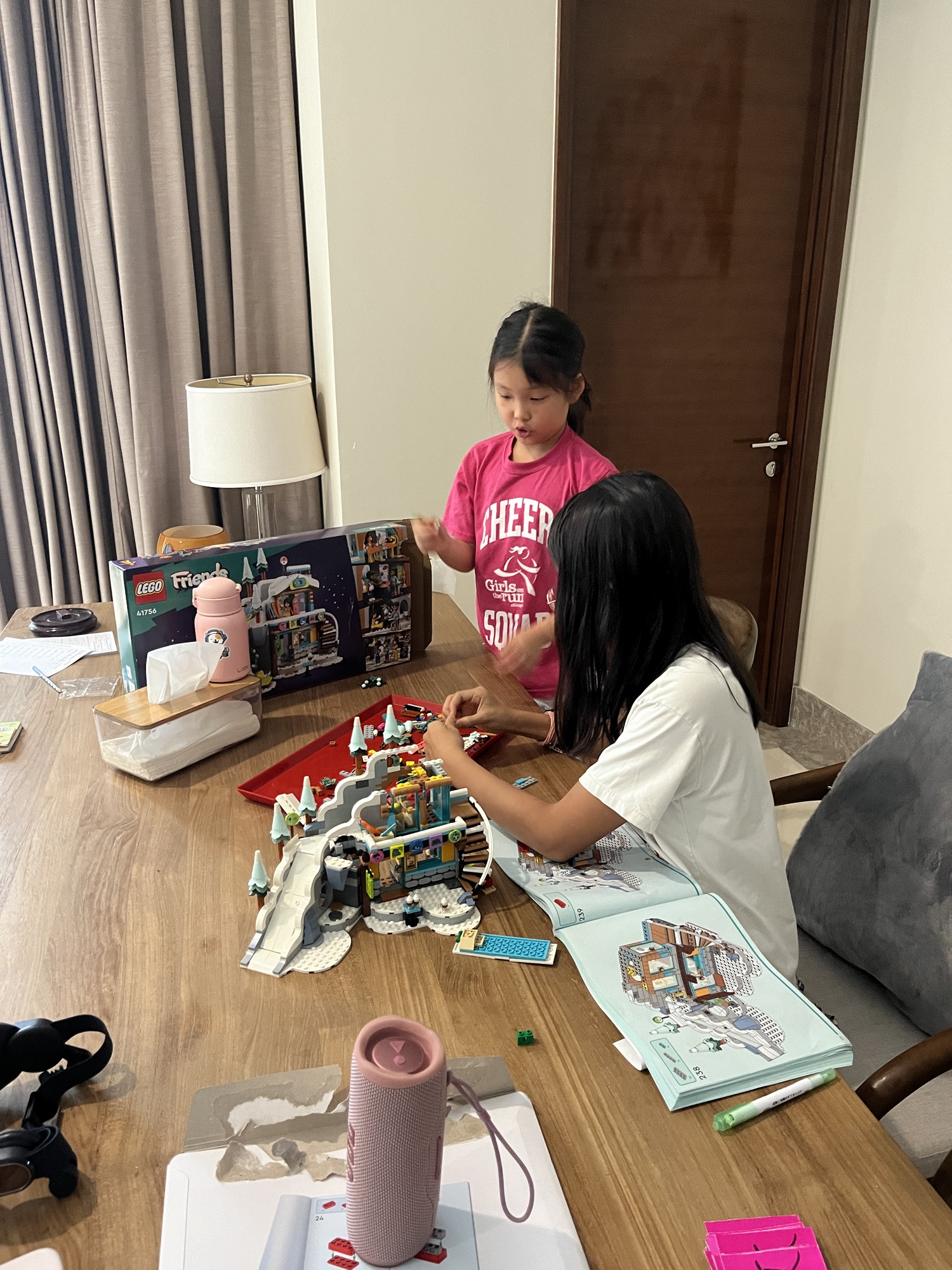 12pm: got back, girls still working on the lego. Lizzy was ON the table by then.