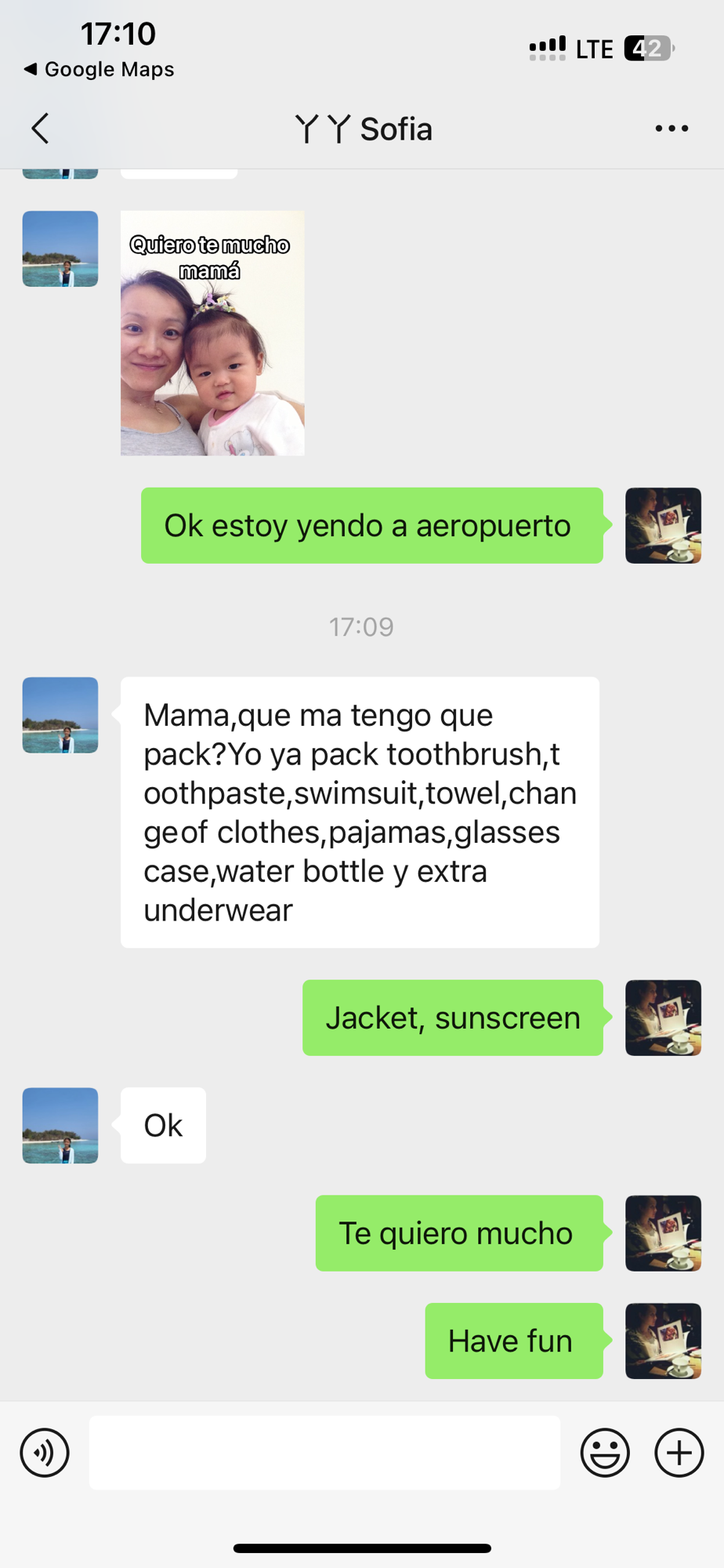 Sofia also asked me about what to pack for her fancy sleepover at a 5 star hotel, birthday celebration of her friend. The mix of Spanish and English is common in our written communication.