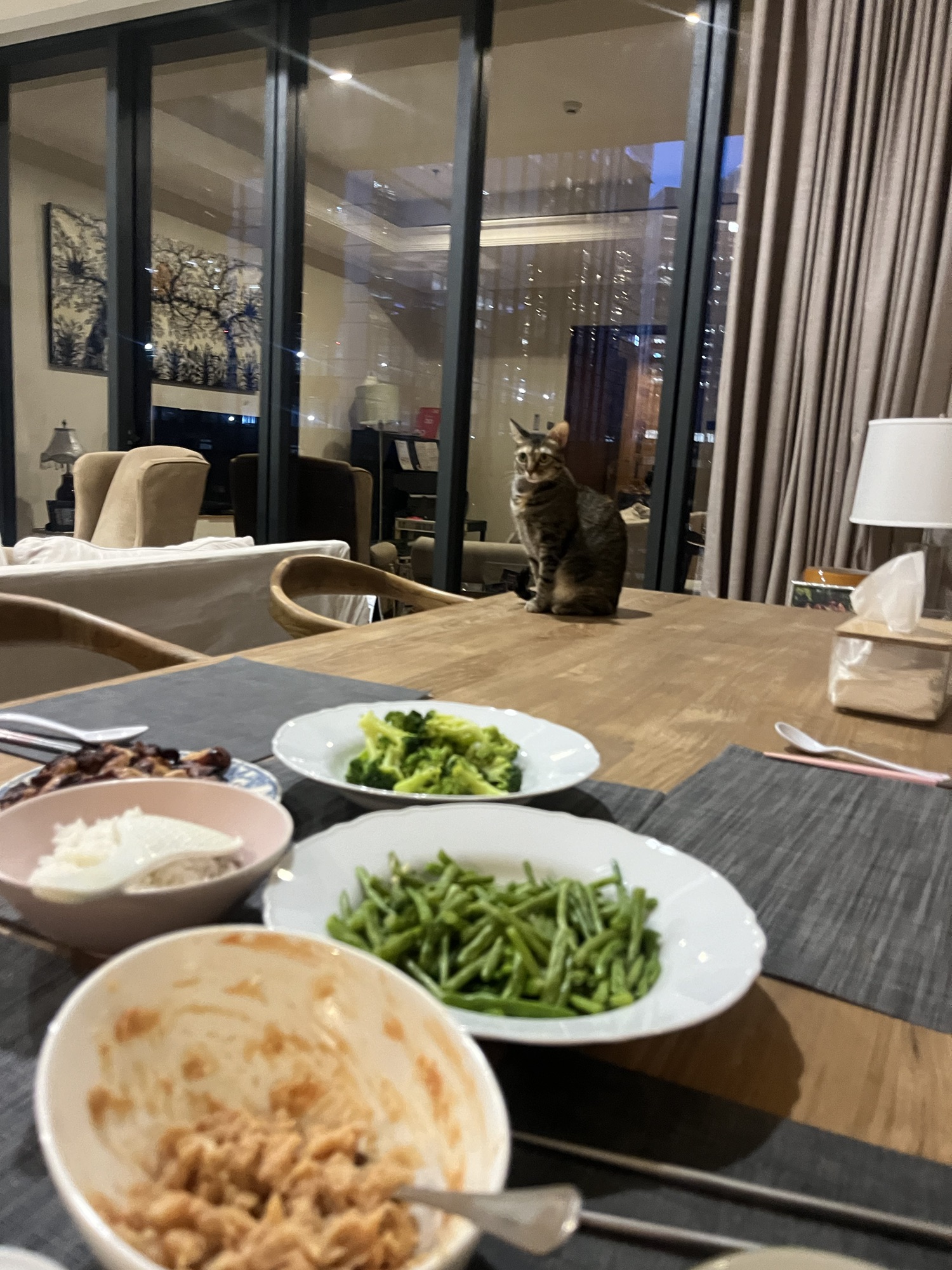 I ate dinner alone, with Cookie, while waiting for the family to come back from swimming.