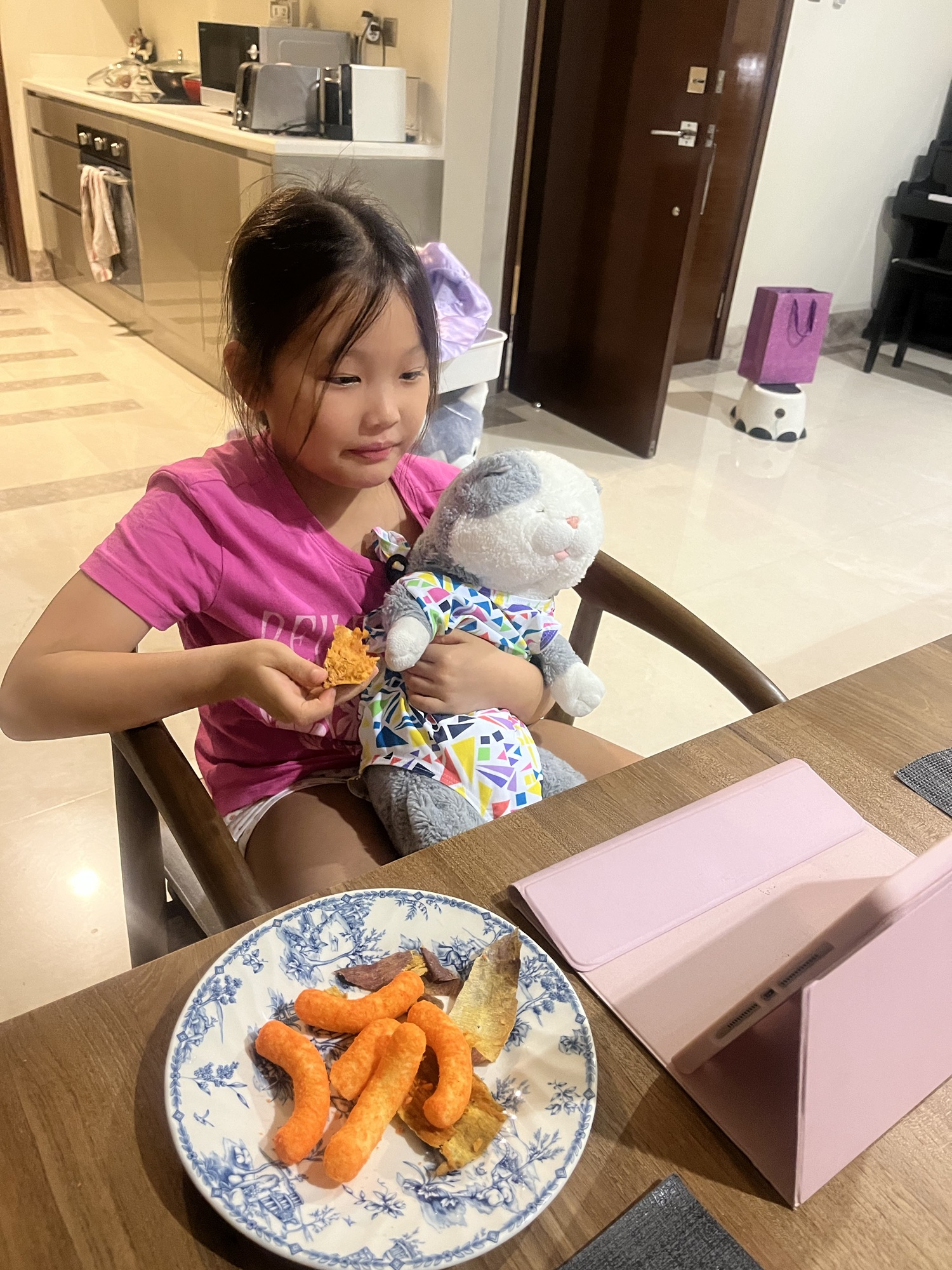Sunday netflix time with her stuff toy, dressing up with Lizzy’s swimsuit, and snacks. Happy time.