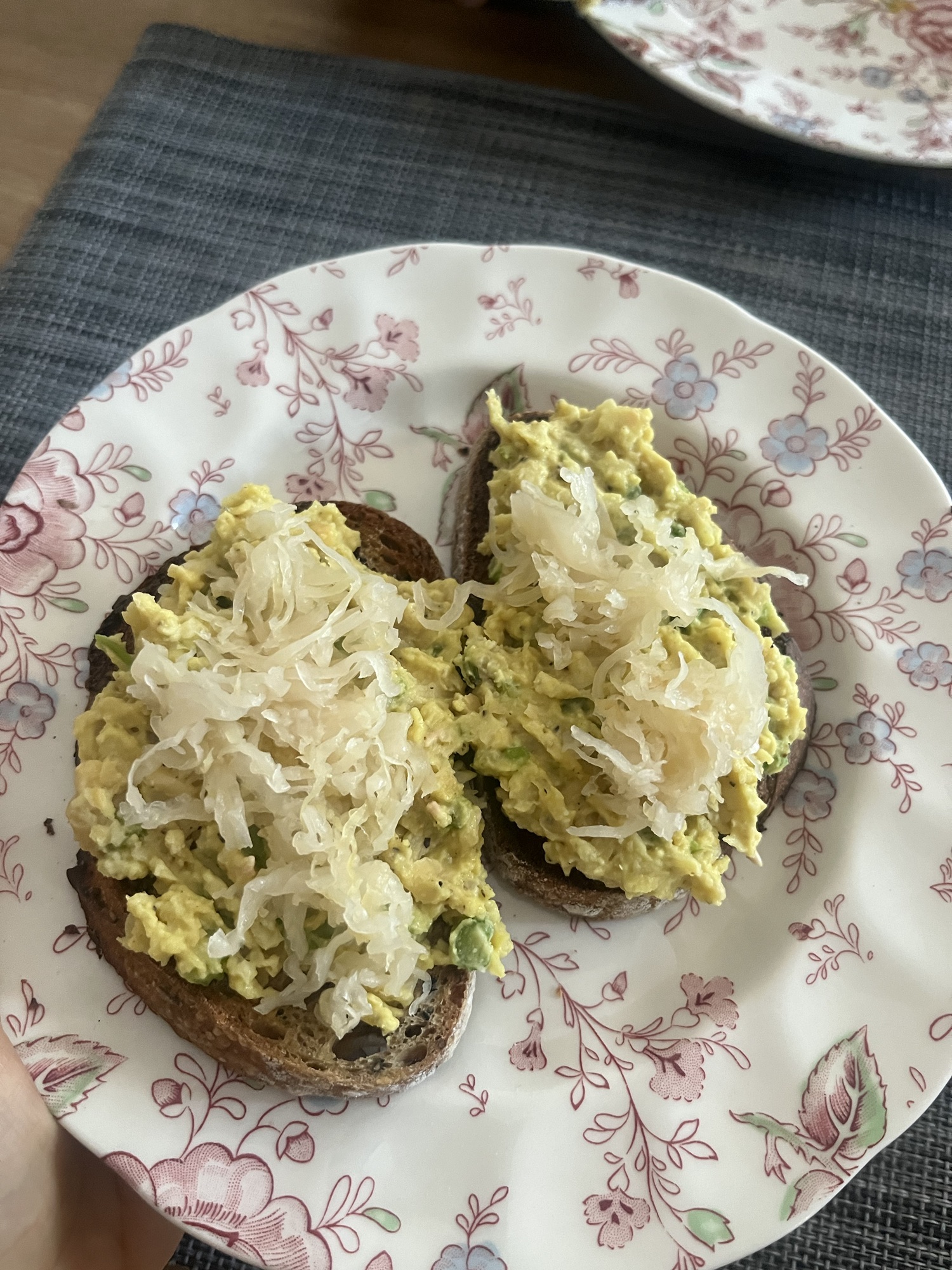 chickpea salad, both husband and I love it, made it twice already. I didn’t had vegan mayonnaise so used tahini instead. Top it with saurkraut.