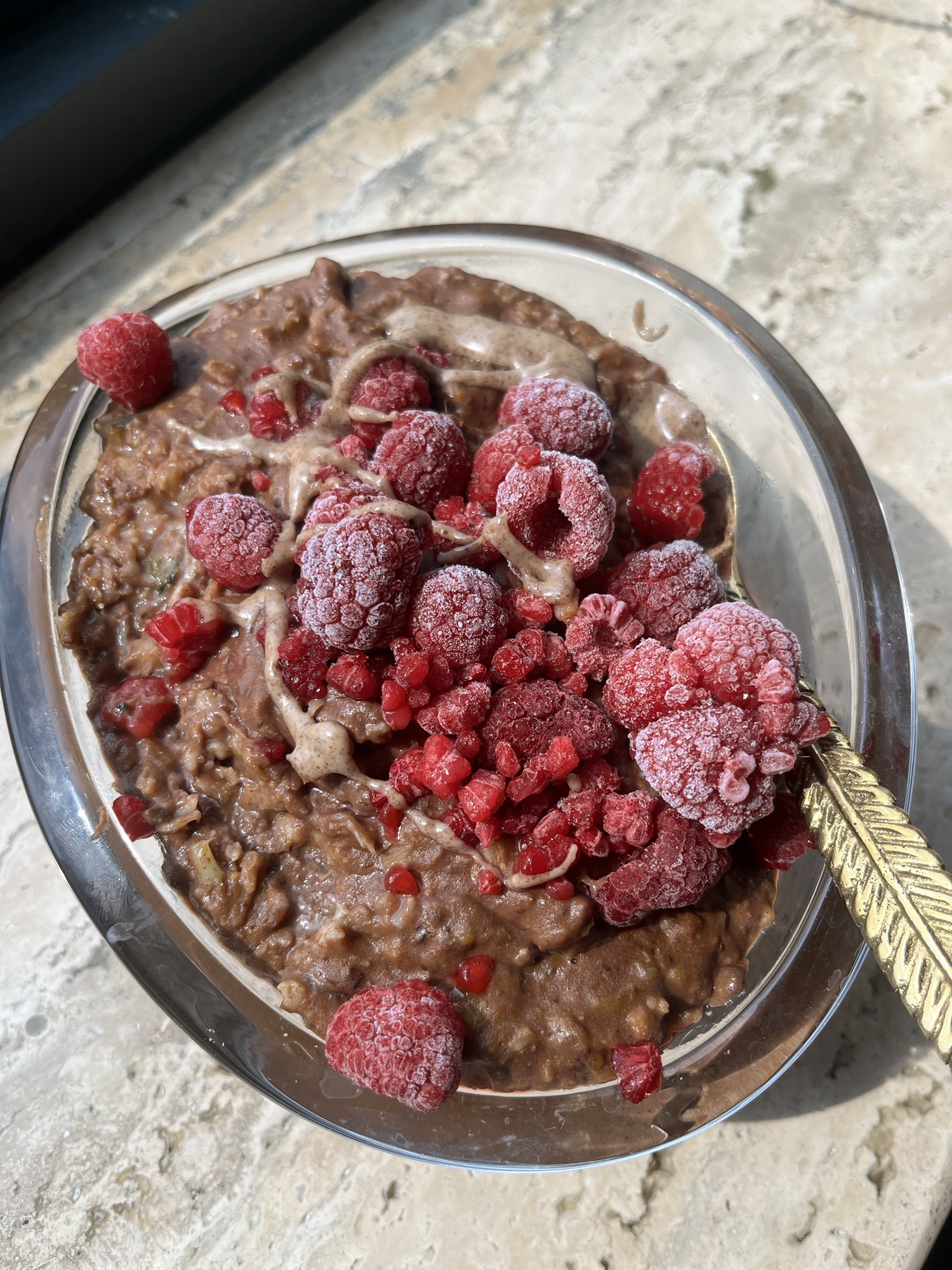 Breakfast remains the same, oatmeal with protein powder, flax and chia, cacao powder, top with berries and almond butter.