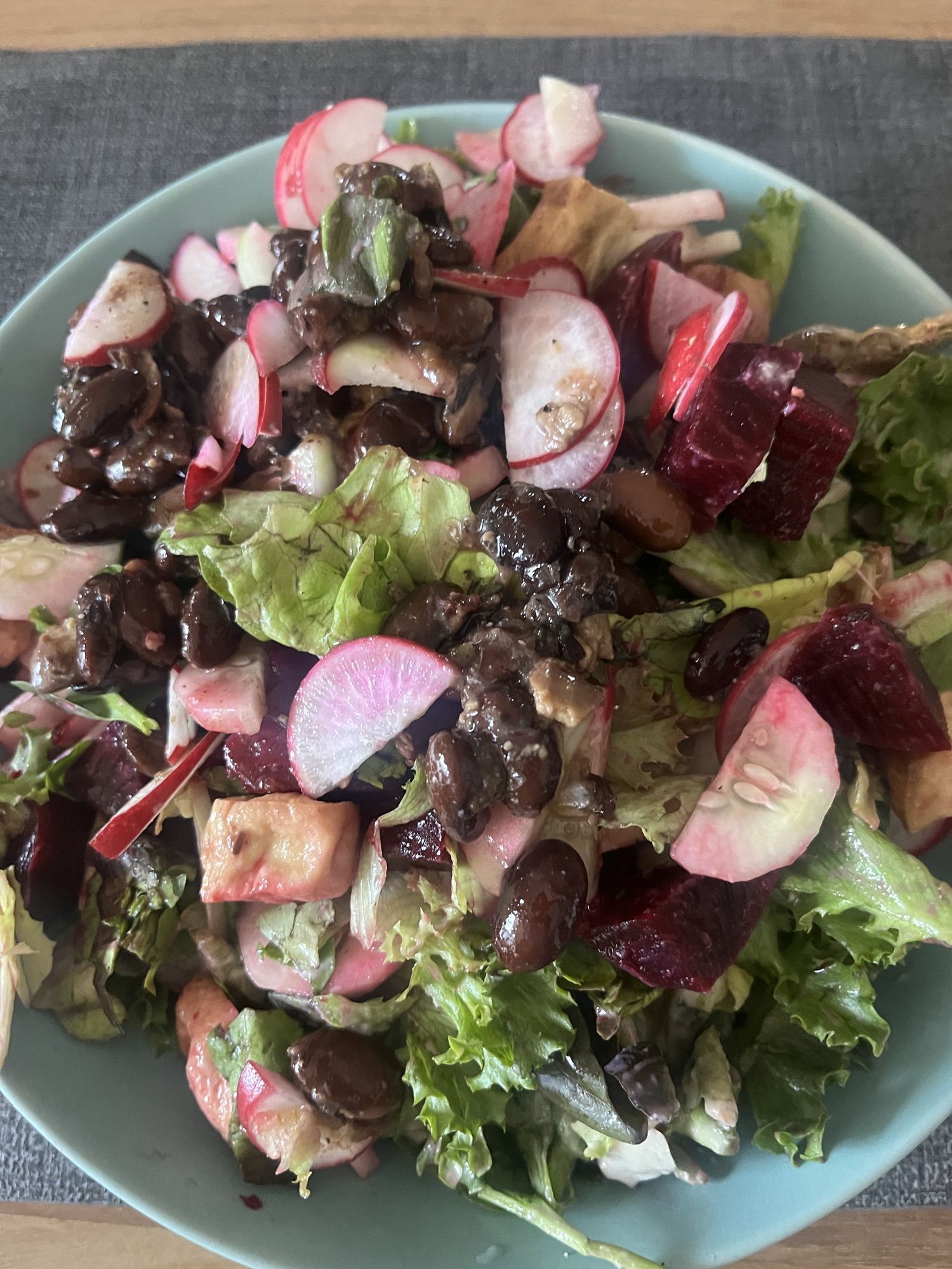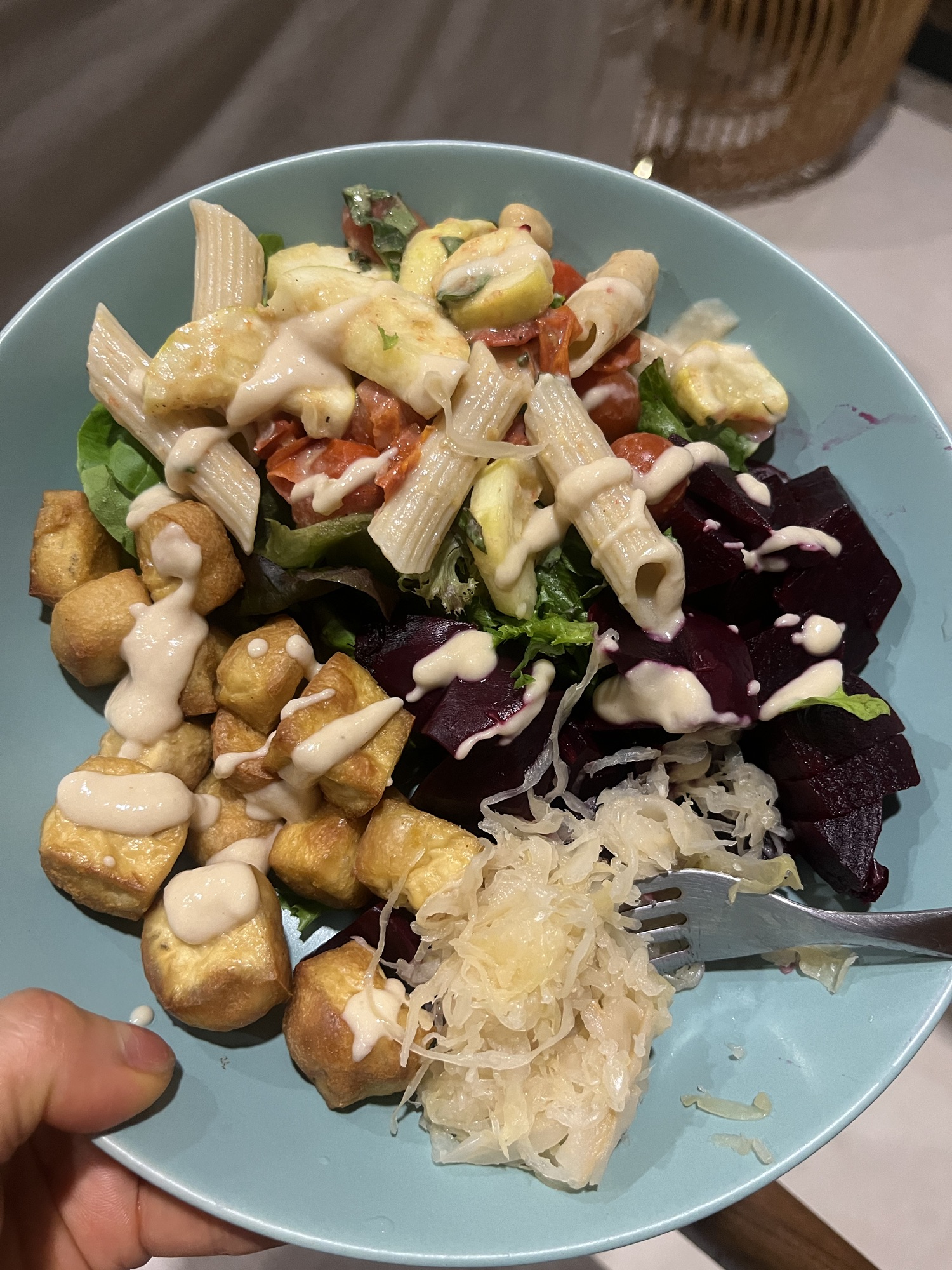 I had a lot of these bowls with various leftovers. This one had a pasta salad, beets, fried tofu, sauerkraut, tahini.