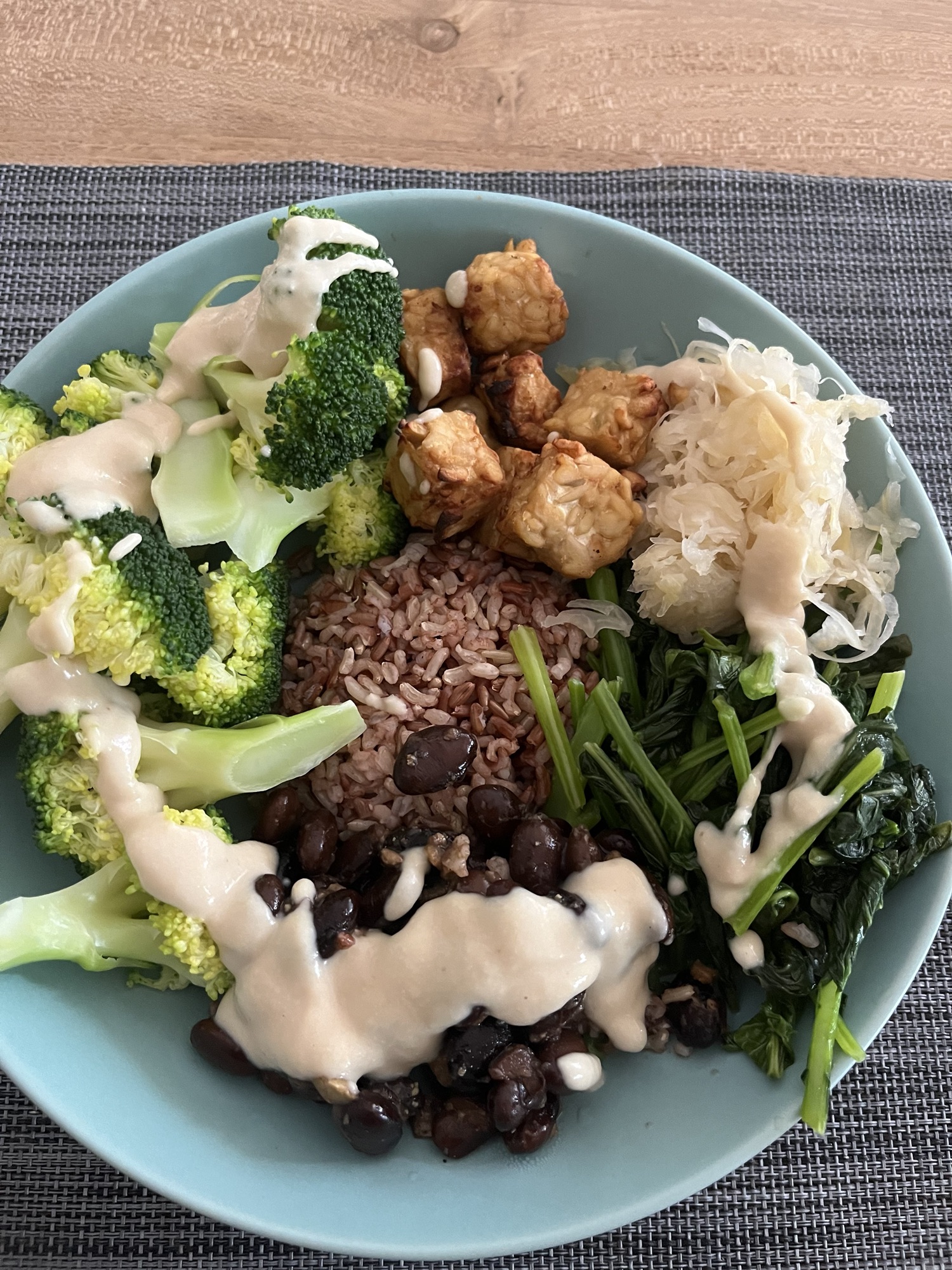 buddah bowl with brown rice, black beans, air fried tempeh, broccoli, spinach, tahini sauce