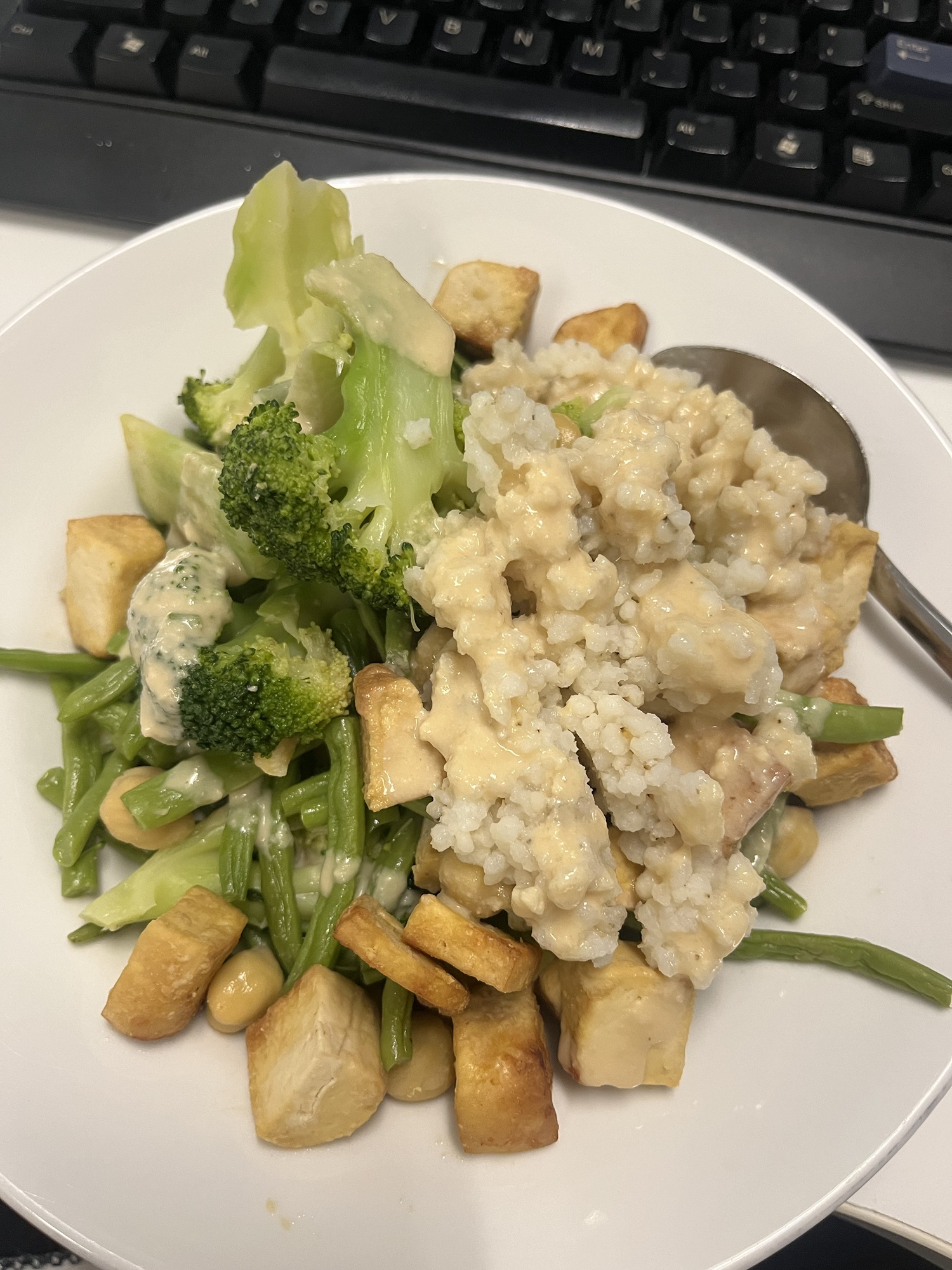 I pack for lunch to work, always leftovers. This time I had broccoli, tofu, sorghum and tahini dressing