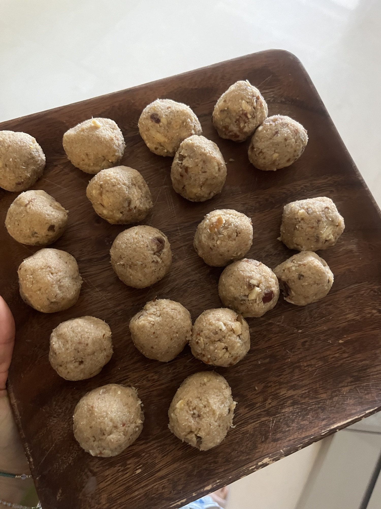 bliss ball made with dates, cashews, oat flour, and maple syrup