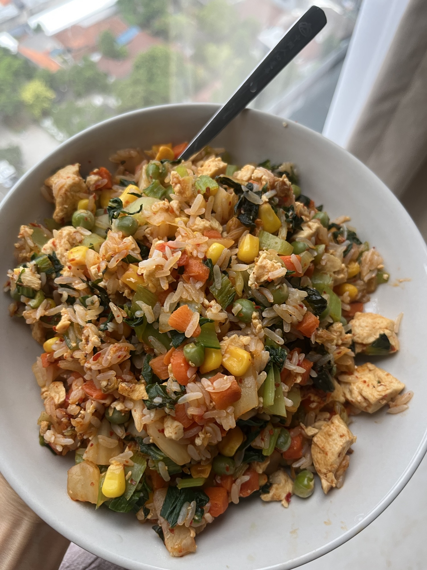 Kimchi fried rice with tofu and assorted vegetables. I’m obsessed with it
