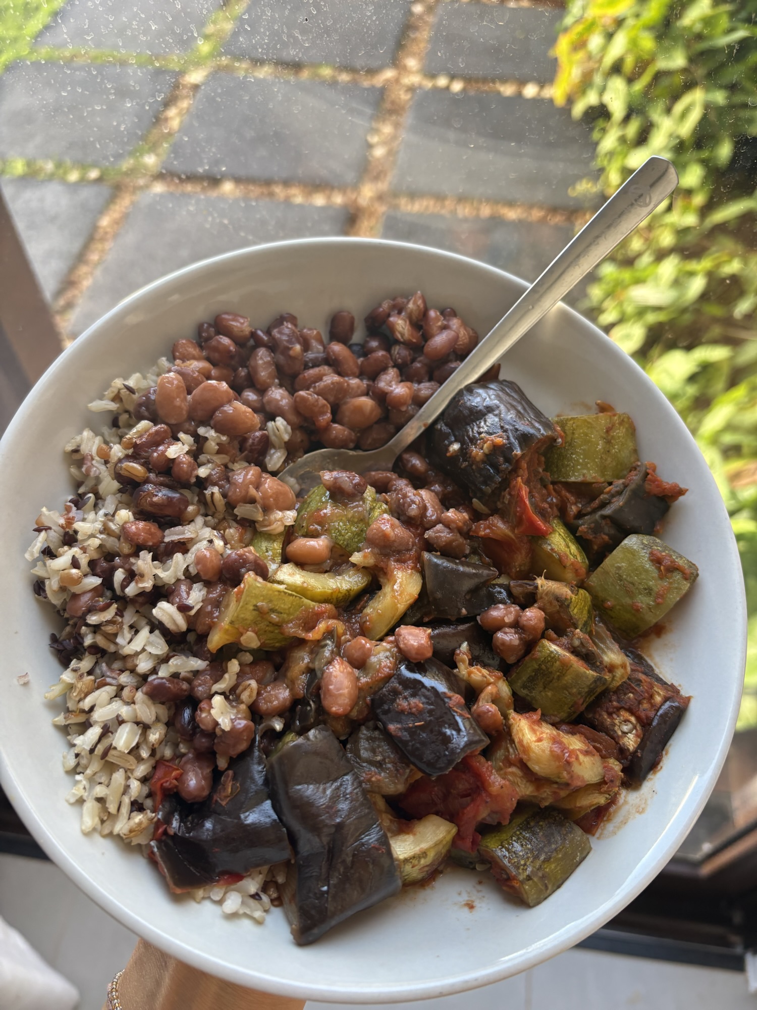 When I work from home, I usually grab whatever I can assemble for lunch with leftovers or freezer meals. This one had rice, beans, roasted veggies with tomato sauce. It is nourishing and exactly what I craved.