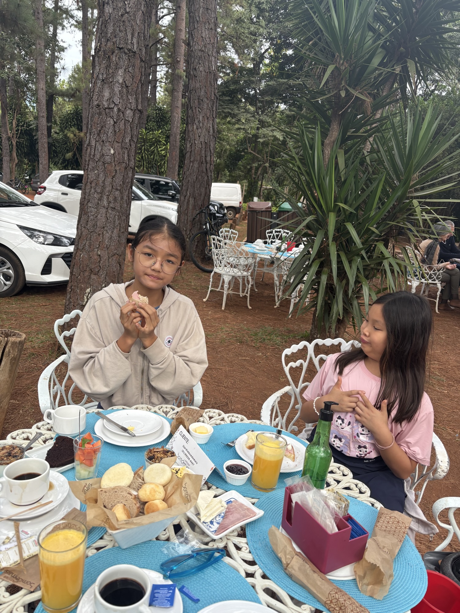 Girls had a late lunch/snack at our terrace, pretending they are at a picnic. So cute.