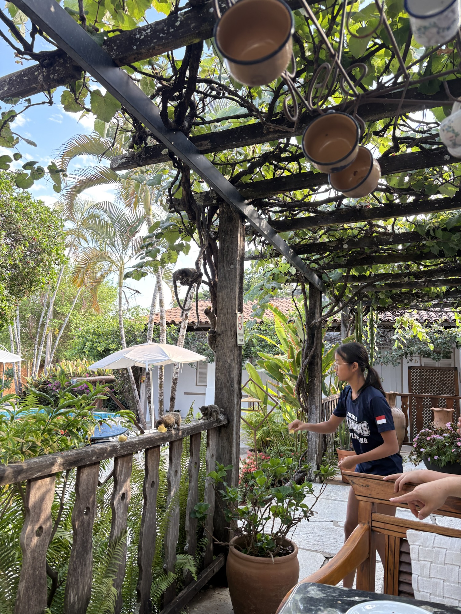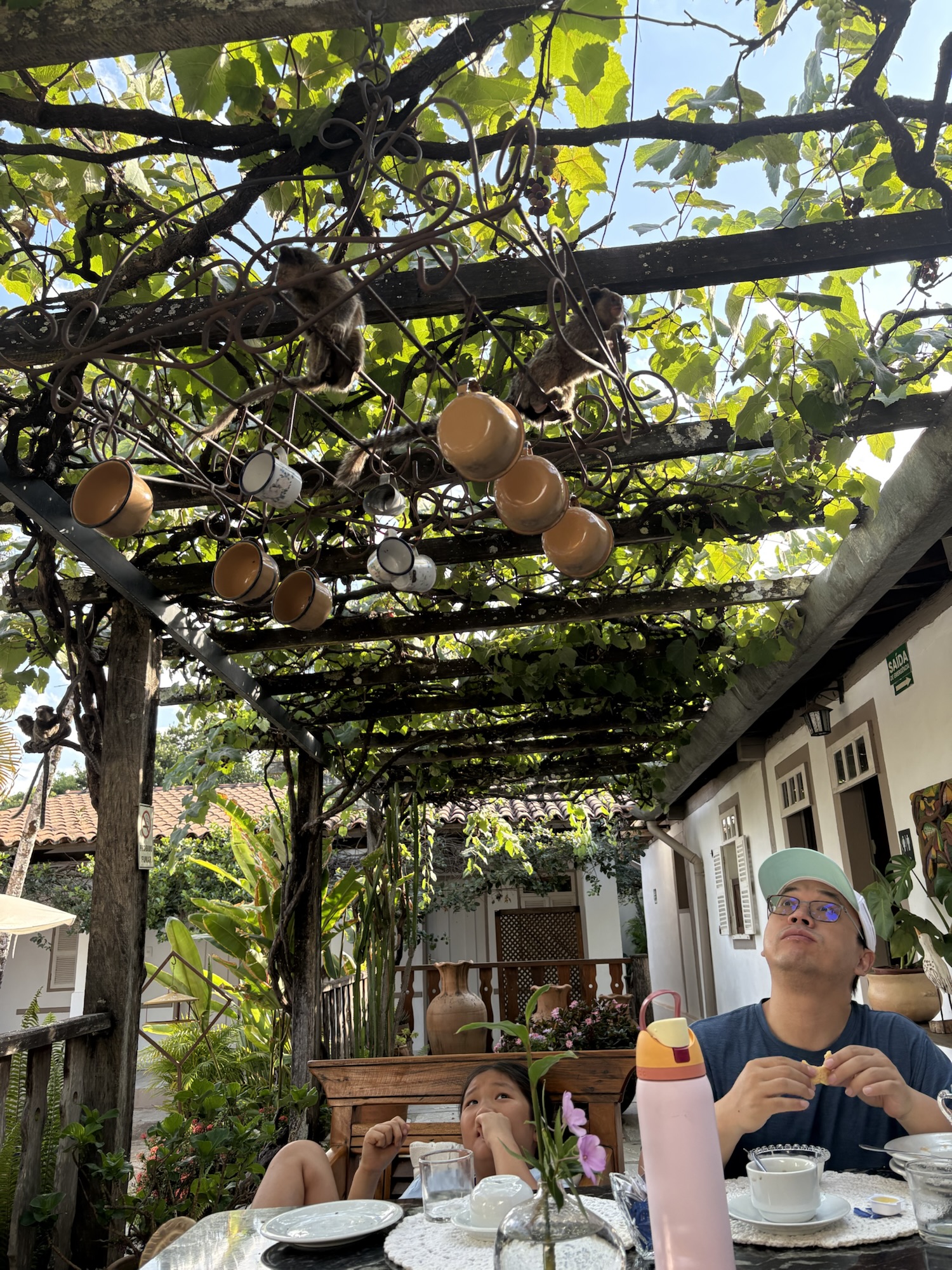 while we were eating, we realized that the owner left a piece of cake and small monkeys came to join us.