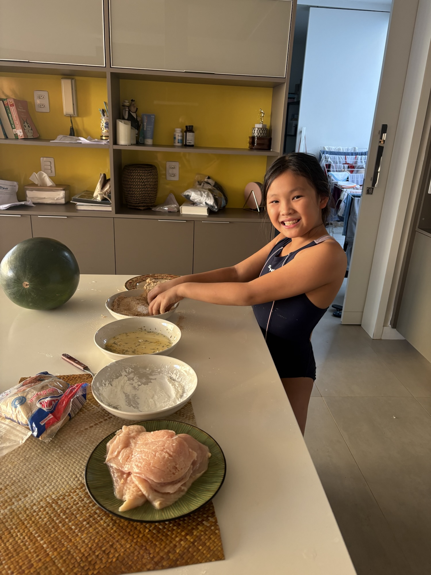 The rest of our weekend went smooth, despite I had to work half of Saturday. While we waited for Sofia to come back, Lizzy helped me make chicken milanesas. Yes! she did all the steps!