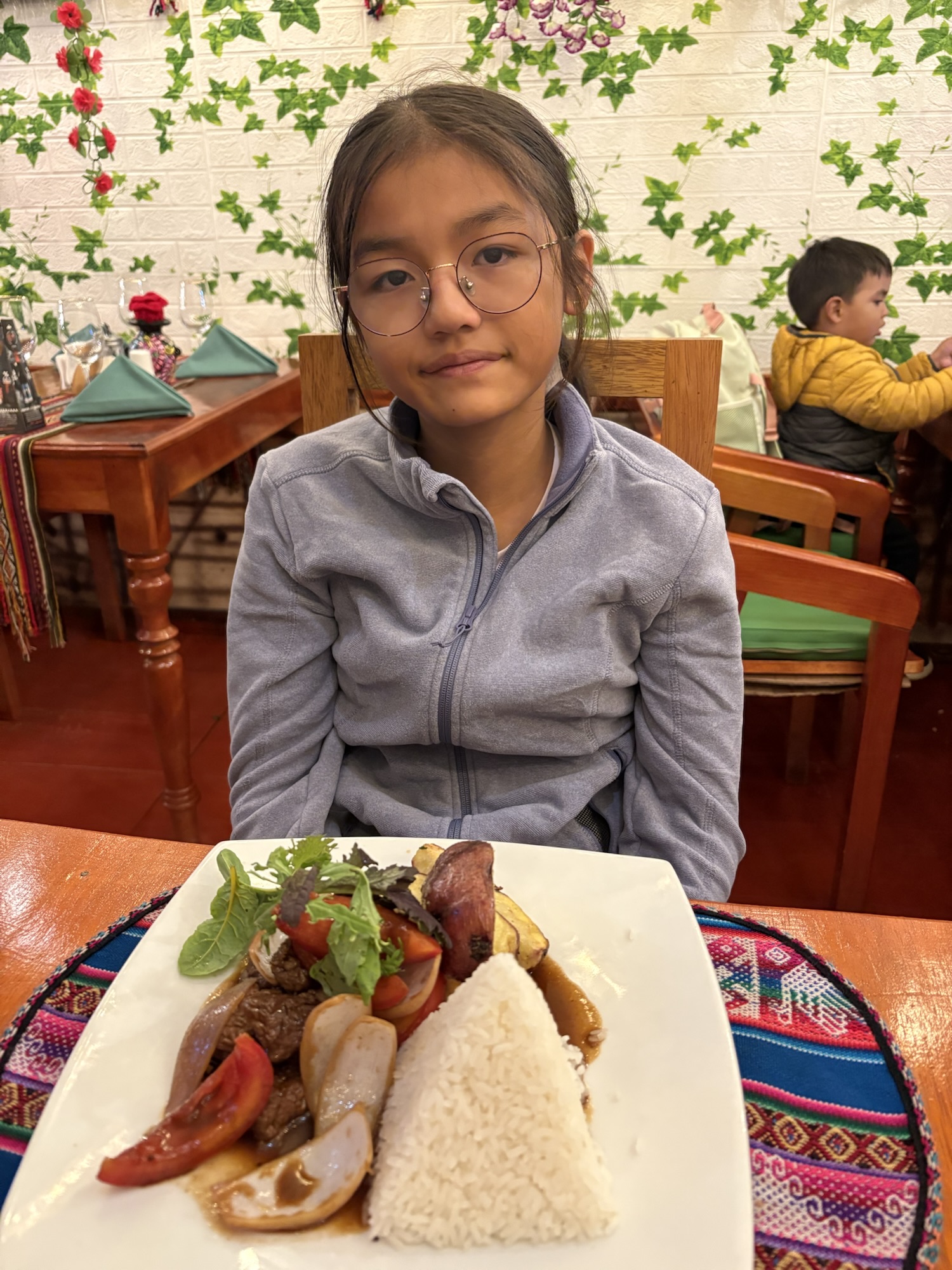 Lizzy and daddy stayed near by our airbnb and had dinner at a Thai restaurant. Lizzy seemed to suffer from high altitude sickness right away, feeling heavy breathing and light headache. Daddy also developed a headache right away. Sofia and myself had no symptoms, just tired by the time we got dinner, around 9pm. Sofia had the classic lomo salted