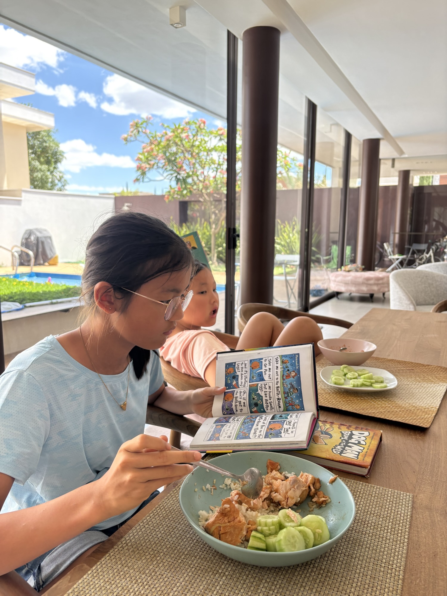 Girls love reading while eating. not the best habit, but better than with the phone, right?