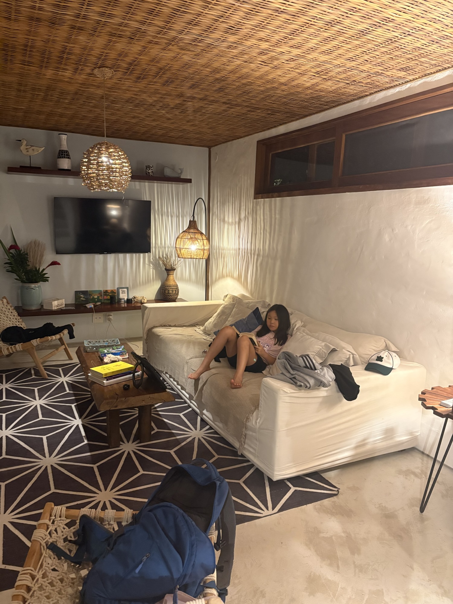 It’s raining but our villa is super cute and at the center of Quadrado. Just finished dinner, had moqueca, typical Bahia dish for the family to try.