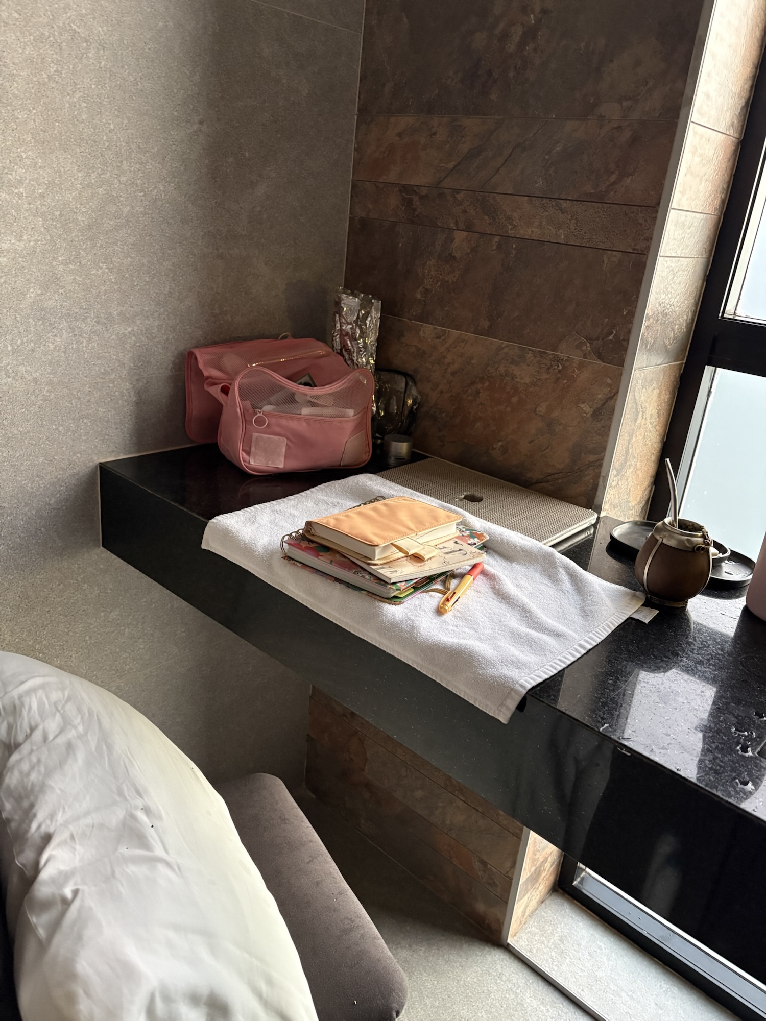 Let me leave you with this pic taken at the last hotel room bathroom. This is my set up for morning mate time with my stack of journals. I like to wake up before everyone and have 450-60 min quiet alone time. When traveling, I try to calf out this time/space too.